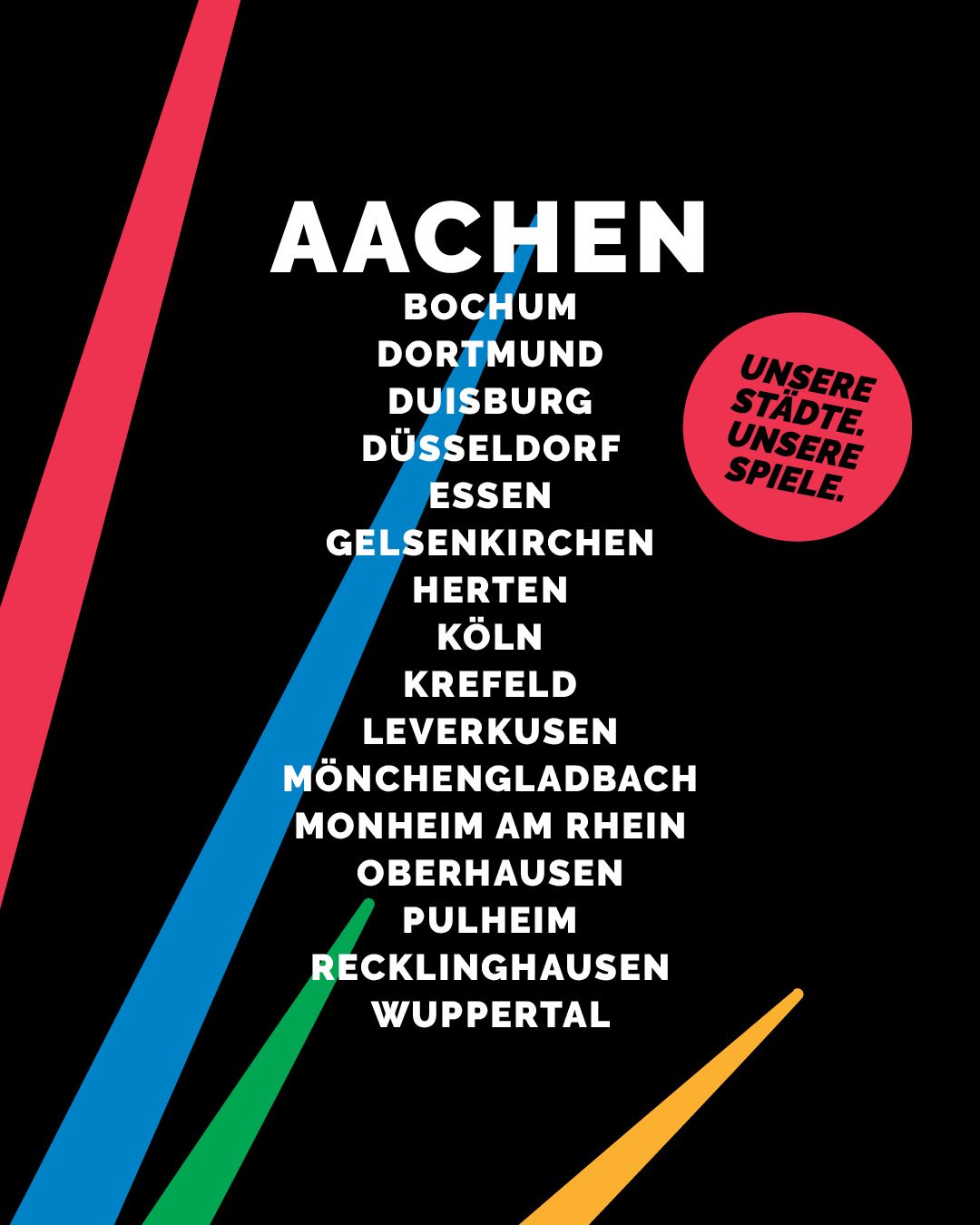 Um die Menschen in Nordrhein-Westfalen bis zum Ratsentscheid bestmöglich zu informieren, hat unter dem Slogan „Unsere Städte. Unsere Spiele“ eine breitangelegte Kampagne begonnen. Mit dieser wollen die 17 beteiligten Kommunen gemeinsam mit der Landesregierung, dem Landessportbund NRW und dem Behinderten- und Rehabilitationssportverband NRW, mit Athletinnen und Athleten sowie den Sportfachverbänden für ein positives Votum bei der Abstimmung werben.