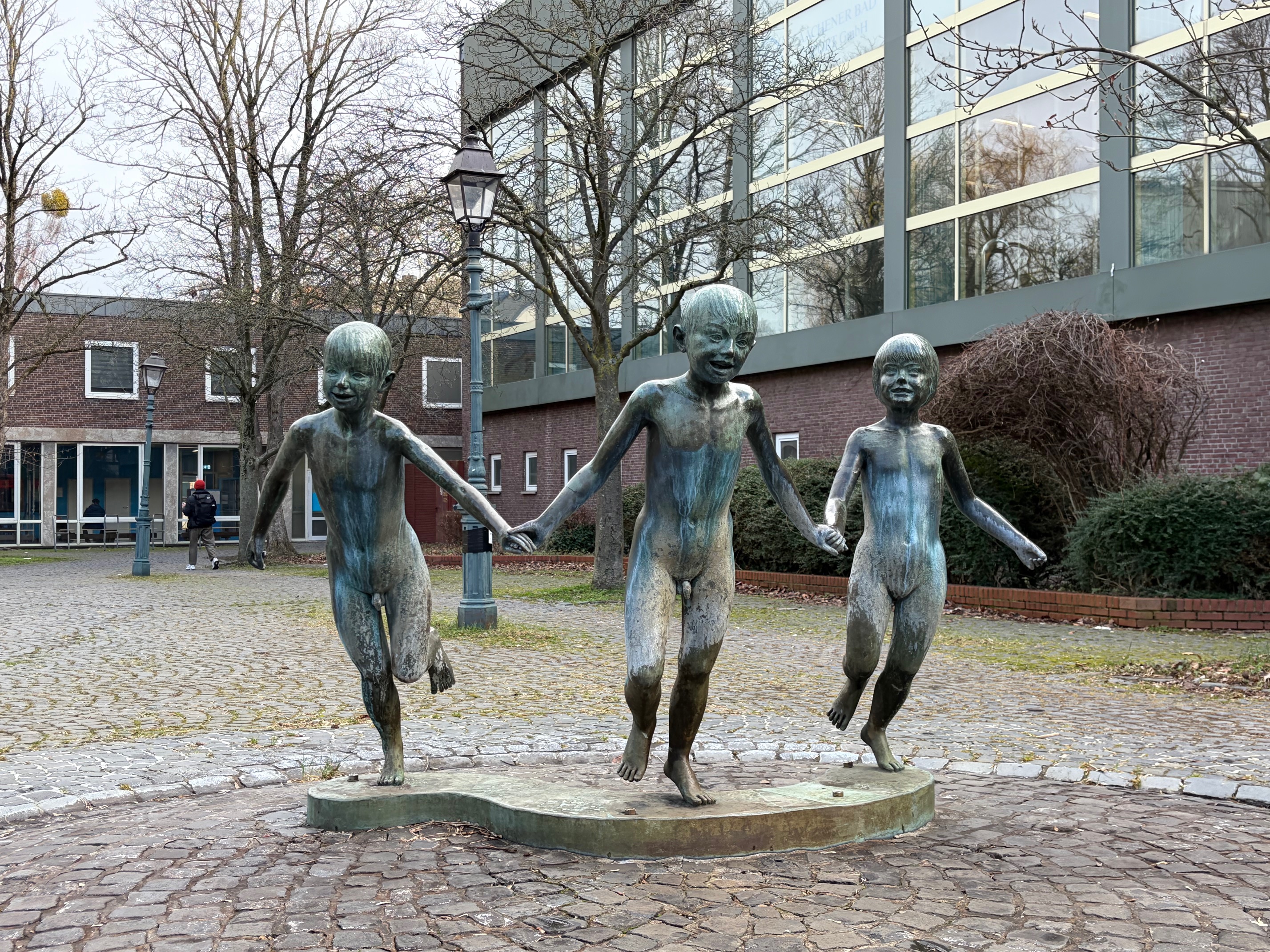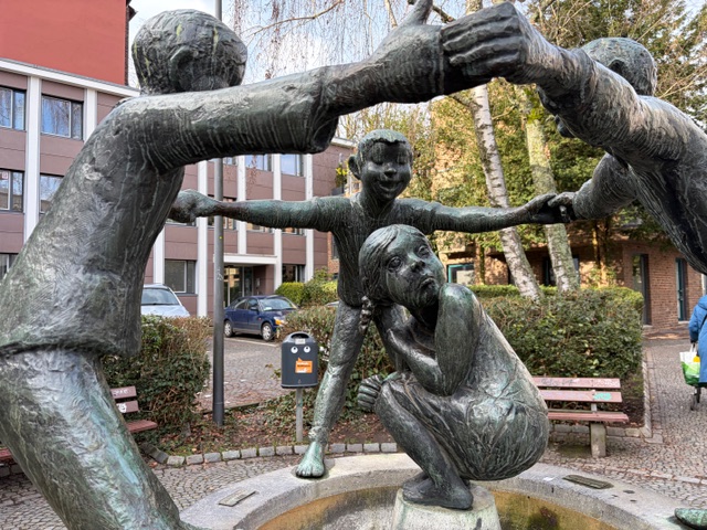 Der Brunnen zeigt ein Mädchen, das daran gehindert wird, die Toilette aufzusuchen und das sich deshalb in die Hose pinkelt. Der Kleinen ist das peinlich, sie schaut ängstlich. Drei Jungen hindern sie am Gehen und finden ihre Not amüsant, sie lachen. Freude empfinden, wenn anderen ein Leid geschieht, das ist nicht gerade das, was man im öffentlichen Raum sehen möchte.