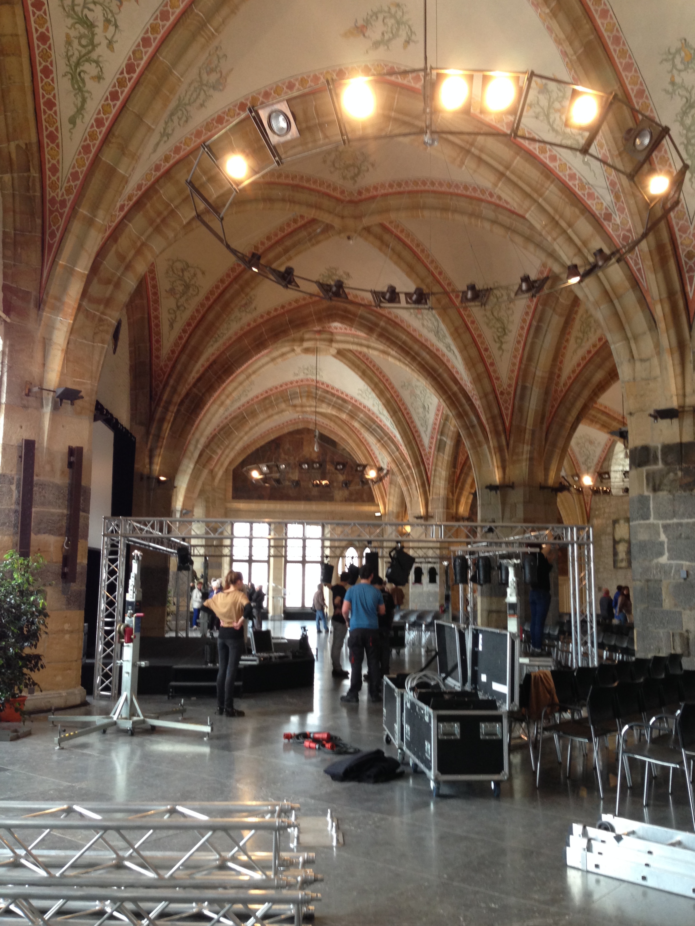Am 29. Mai wird im Krönungssaal der Karlspreis verliehen. Schon jetzt hat man mit dem Aufbau der Bühne begonnen (Foto).