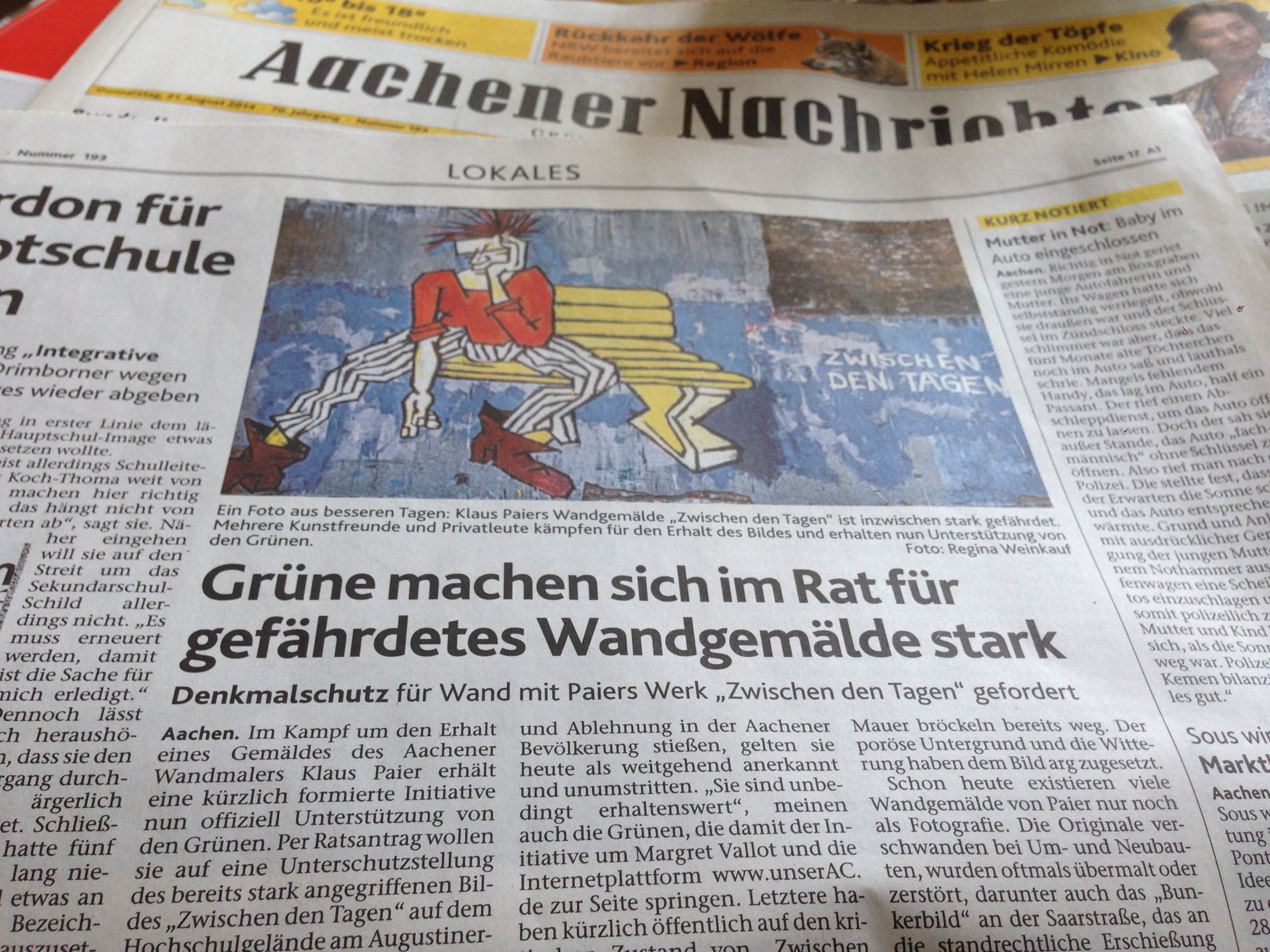 Was die Rettung der Paier-Graffitis betrifft, stellt sich mir die Sache jetzt so dar: Das Interesse am Erhalt der Arbeiten von Klaus Paier ist erfreulich groß und wird noch immer größer. Und es haben sich schon seit vielen Jahren Privatleute darum bemüht, die einzigartige Kunst des Aachener Wandmalers in die Zukunft hinein zu retten.
