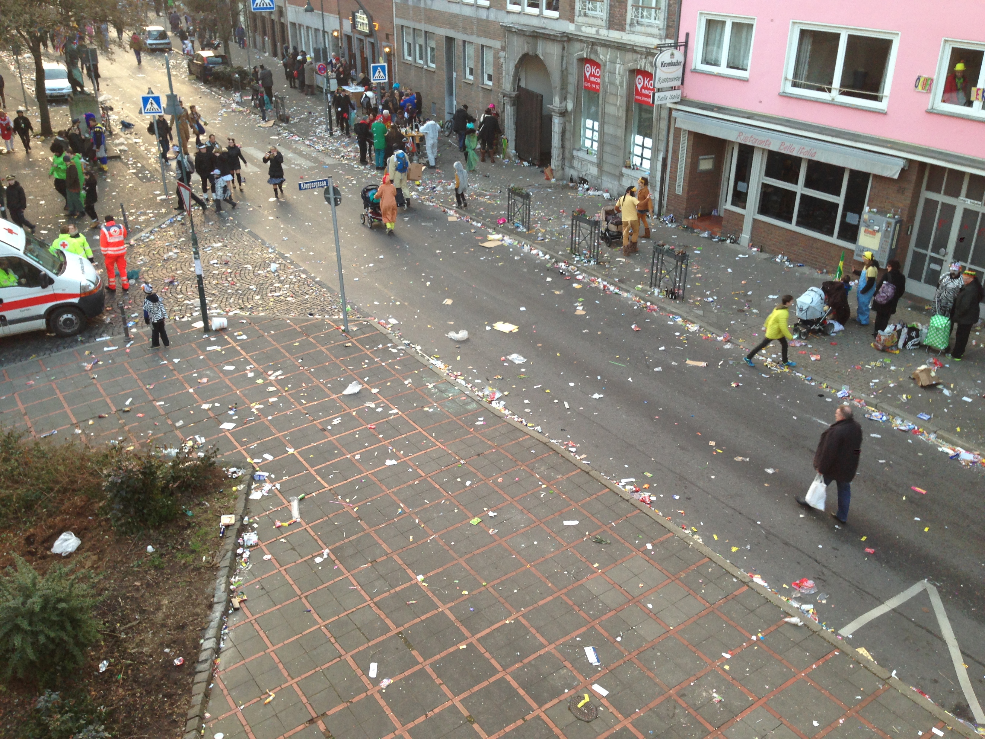 Vier Stunden lang geht es nun ununterbrochen rund: Fußgruppe folgt auf Musikkorps folgt auf Narrenschiff folgt auf Pferdestaffel folgt auf ichweißnichtwas. Die ersten drei Stunden sind die Zuschauer noch fit und aktiv, singen, tanzen, rufen „Alaaf“ so laut sie können. Und aus den Wagen regnet es Printen, Popkorn, Rosen, Süßes, Schokotaler, Stofftiere und was sonst kein Mensch braucht.