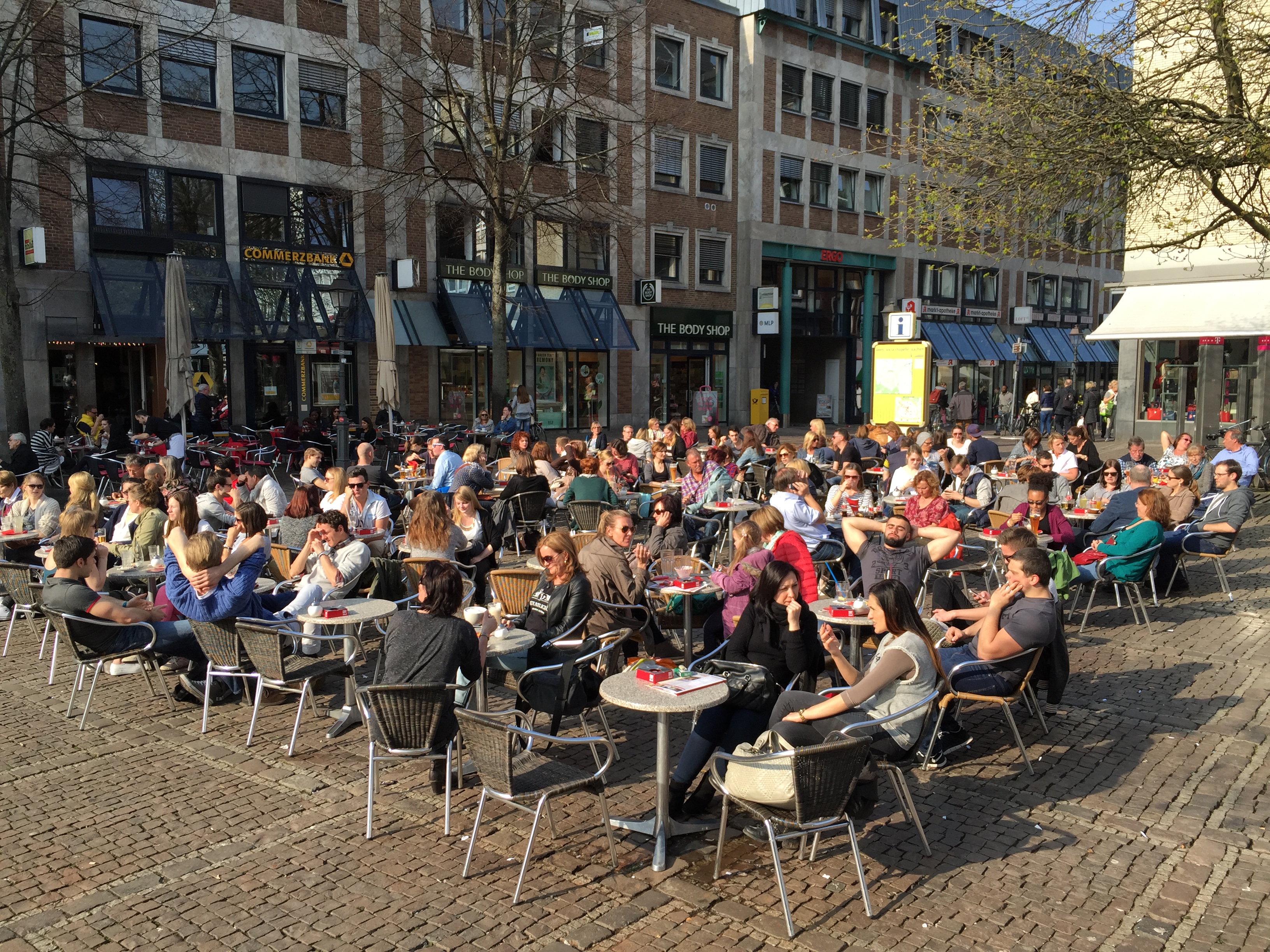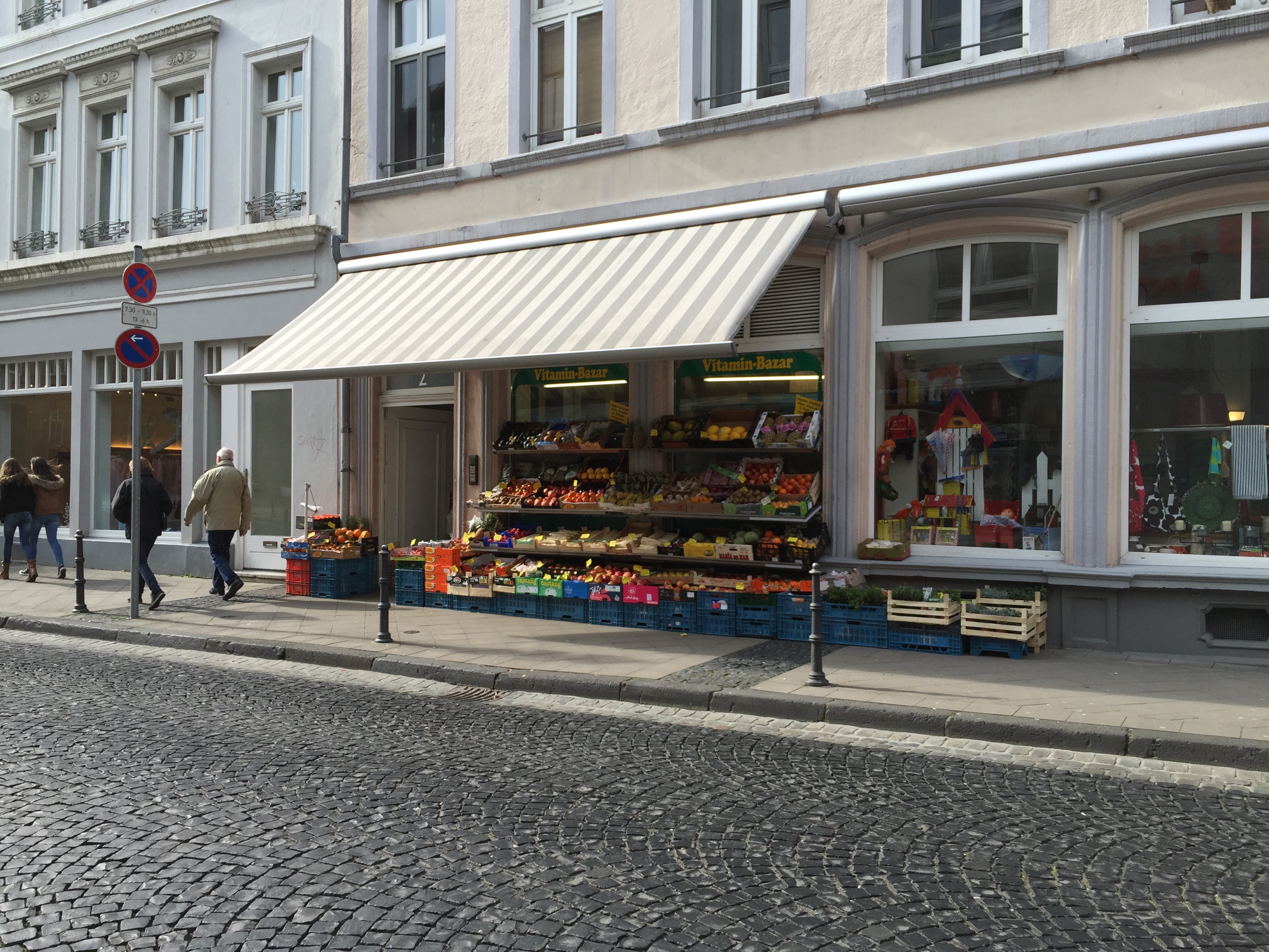 Gute Idee. Der Feierabendmarkt könnte zugleich die Innenstadtbewohner mit Obst und Gemüse versorgen und meinetwegen auch mit Fisch, Eiern, Gewürzen, Käse. Denn soooooo viele Lebensmittelläden gibt es rund um Dom und Rathaus nicht mehr. Eigentlich nur einen, nämlich Kaiser’s. Den türkischen Händler in der Jesuitenstraße zähle ich nicht mit, zu teuer. Pontstraße, Neupforte, Augustinerbach, Annuntiatenbach, Eilfschornsteinstraße, Judengasse, Jakobstraße, Klappergasse, Schmiedstraße,