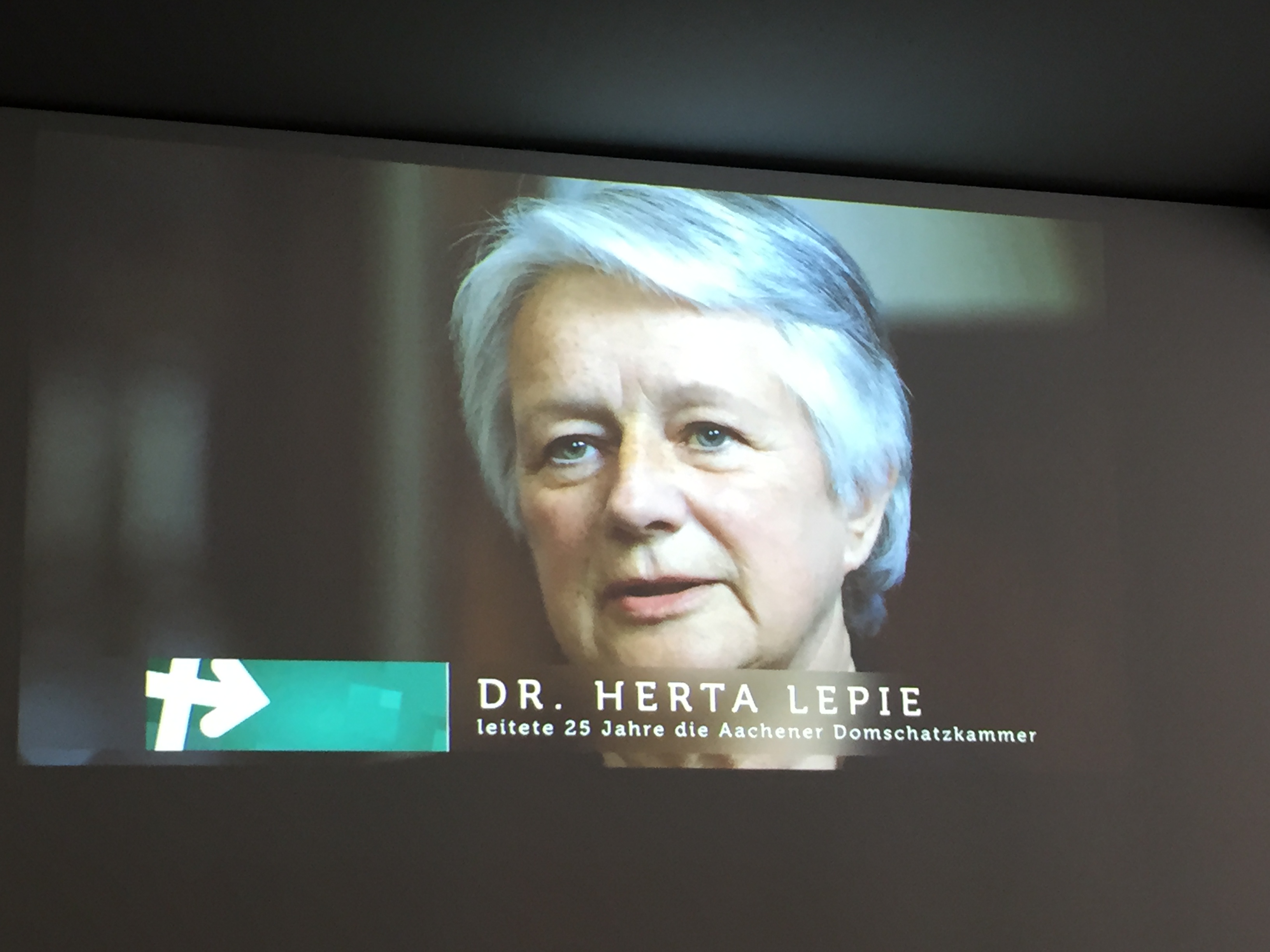 Diese hochgebildete Frau ist Dr. Herta Lepie aus Aachen. Sie hat viele Jahre lang die mit Schätzen randvoll gefüllte Aachener Domschatzkammer geleitet und ist Kunsthistorikerin und Spezialistin für mittelalterliche Goldschmiedearbeiten. Zur Ausstellung des Karlsschreins gab es in den Räumen der Dominformation gleich gegenüber vom Dom Filmaufnahmen zu sehen. Unter anderem sprach darin Herta Lepie über den Karlsschrein, für dessen jahrelange Restauration sie verantwortlich war. Ihr zuzuhören ist ein Genuss.