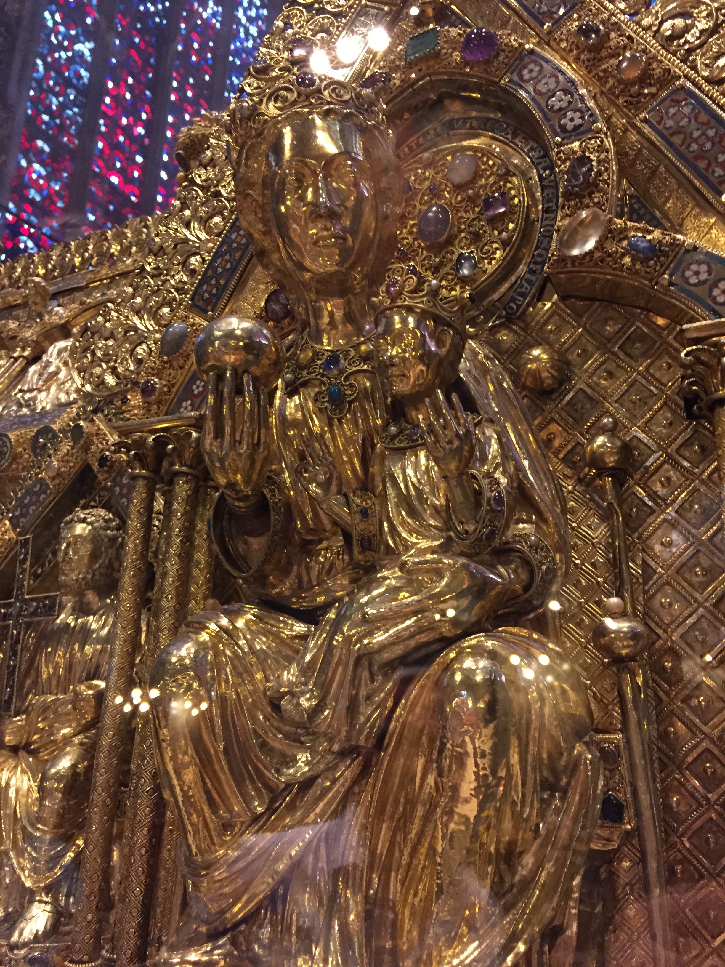 Die ganze Pracht kann man jetzt für wenige Tage aus der Nähe betrachten. Anlässlich des Jubiläums (800 Jahre) wurden die Kostbarkeiten geputzt, und der Schrein wurde in die Mitte des Domes gehievt, ein Schauspiel der Extraklasse, das von ausführlicher Berichterstattung begleitet wurde. Heerscharen von Menschen aus aller Herren Länder ziehen seitdem an dem Sarkophag vorbei, er wird ohne Ende fotografiert und – große Freude – der sonst immer abgeschlossene Teil des Domes mit Marienschrein ist ebenfalls zugänglich.
