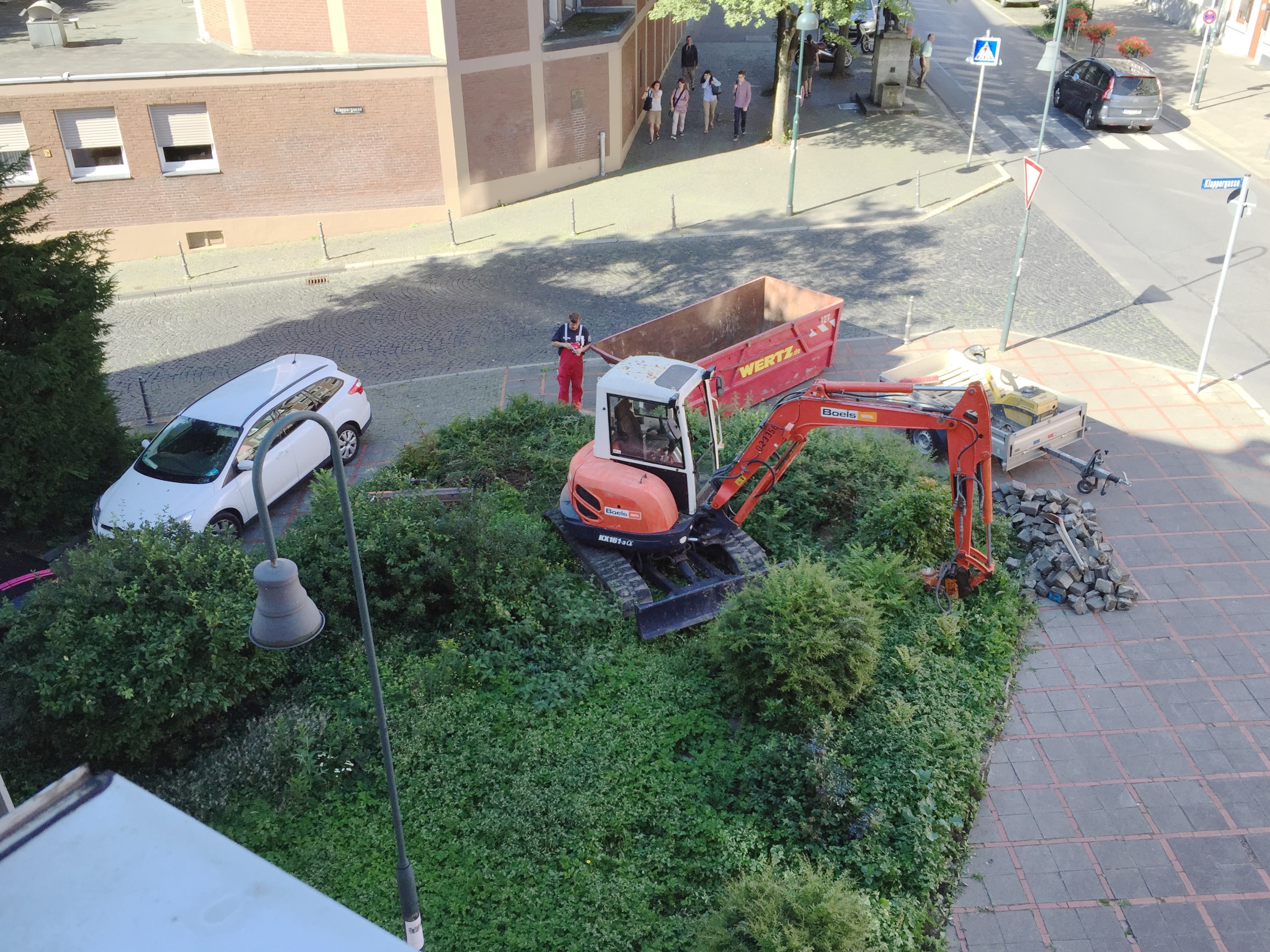Die Stawag hat eine Tiefenrecherche gestartet, und zwar genau unter meinem Arbeitszimmer-Fenster. Heute ist es losgegangen, die Vorhut in Gestalt eines Baggerchens ist schon aufgetaucht. Jetzt weiß ich auch, warum im Januar plötzlich zwei dicke, alte Bäume auf der Ecke Klappergasse/Jakobstraße gefällt werden mussten.