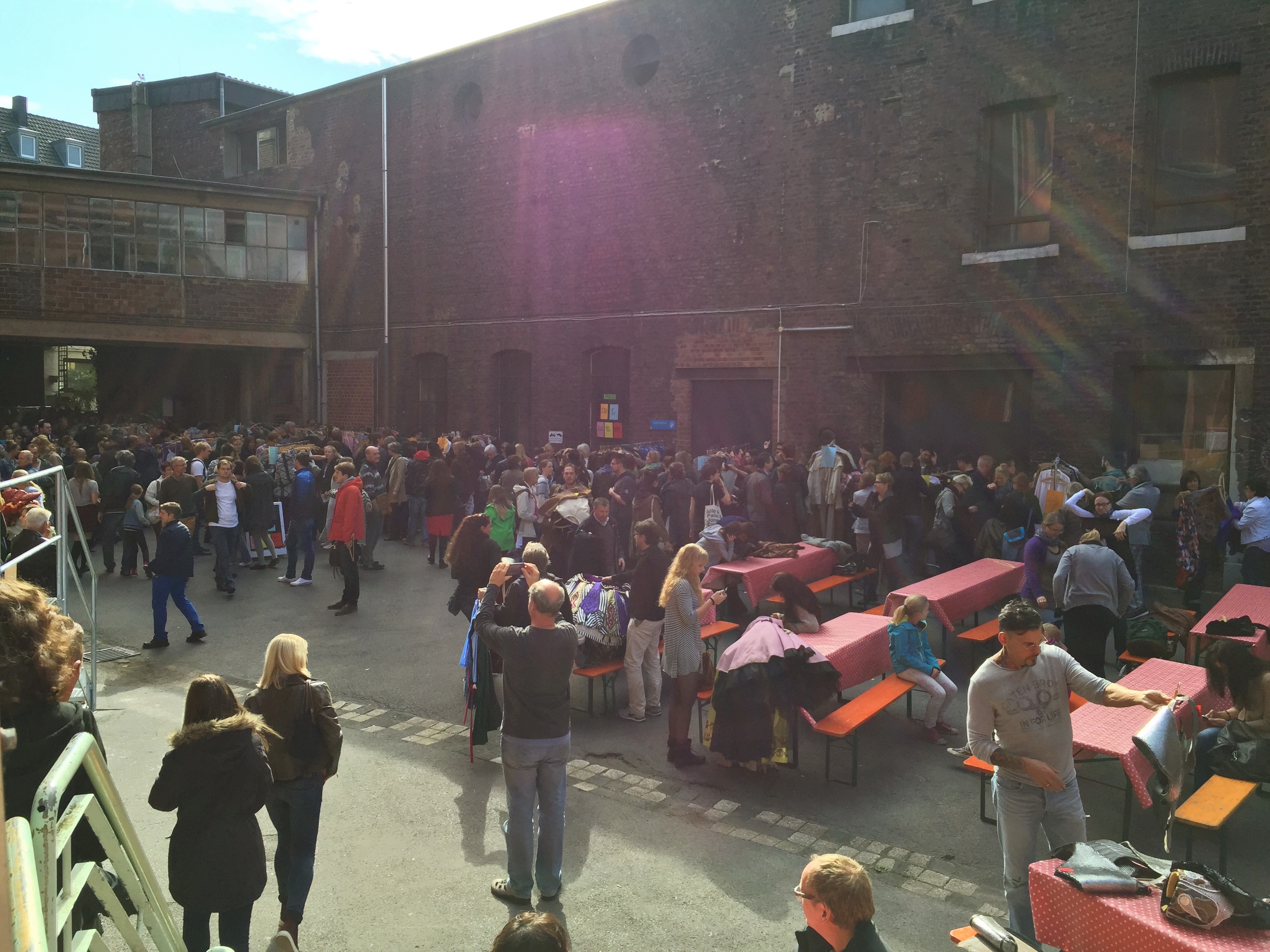Die Kundschaft verteilte sich schnell auf dem Hof des „Mörgens“, wo die Klamotten an den Ständern hingen und farbenfroh leuchteten. Erstmals habe ich es dieses Jahr zum „Mörgens“ geschafft und ganz schön gestaunt. Denn es waren nicht alles schöne Stoffe, die da reißenden Absatz fanden. Billige Stoffe, hurtig zusammengenäht, eindeutig intensiv getragen – so sahen viele Kostüme aus. Für Halloween gerade noch gut genug. Ich merkte schnell, dass ich doch eher neue Kleidung für mich bevorzuge. So habe ich am Ende nichts gekauft, mir war auch die Schlange an der Kasse zu lang.