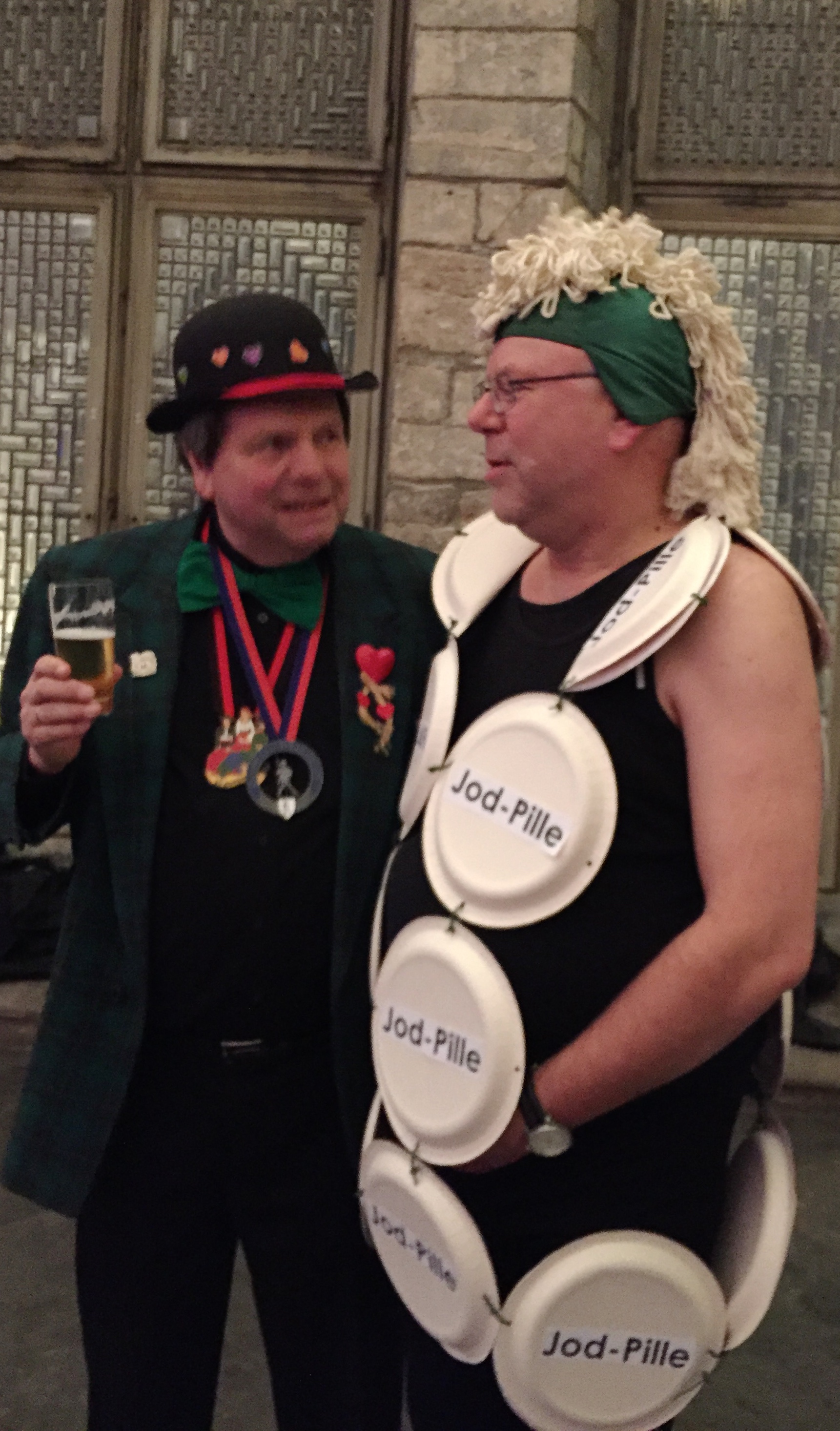 Die Party war wirklich nett und ist ein Tipp für nächstes Jahr: Die närrische Ratssitzung im Krönungssaal (Eintritt frei, jeder darf mitfeiern). Kommunalpolitiker stiegen in die Bütt und nahmen sich selbst und gegenseitig auf den Arm. Fast alle waren kostümiert. Den Vogel abgeschossen hatte der grüne Ratsherr Hermann Josef Pilgram (Foto: s. links) mit seinen überdimensionalen Jod-Pillen. Von den Grünen wurde das Geschwafel über die Jod-Pillen, die im Fall eines Tihange-Atomunfalls helfen sollen, verarscht.
