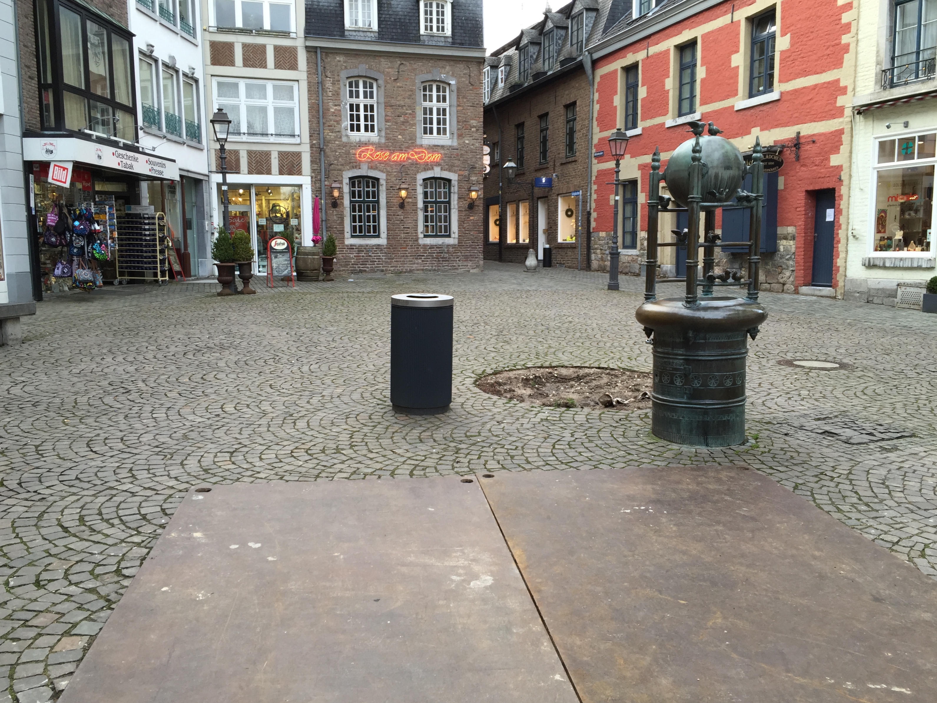 Unter diesen Platten, neben dem Spatzenbrunnen von Künstler und Professor Benno Werth, ist etwas gefunden worden, was Archäologen interessiert: Skelette.