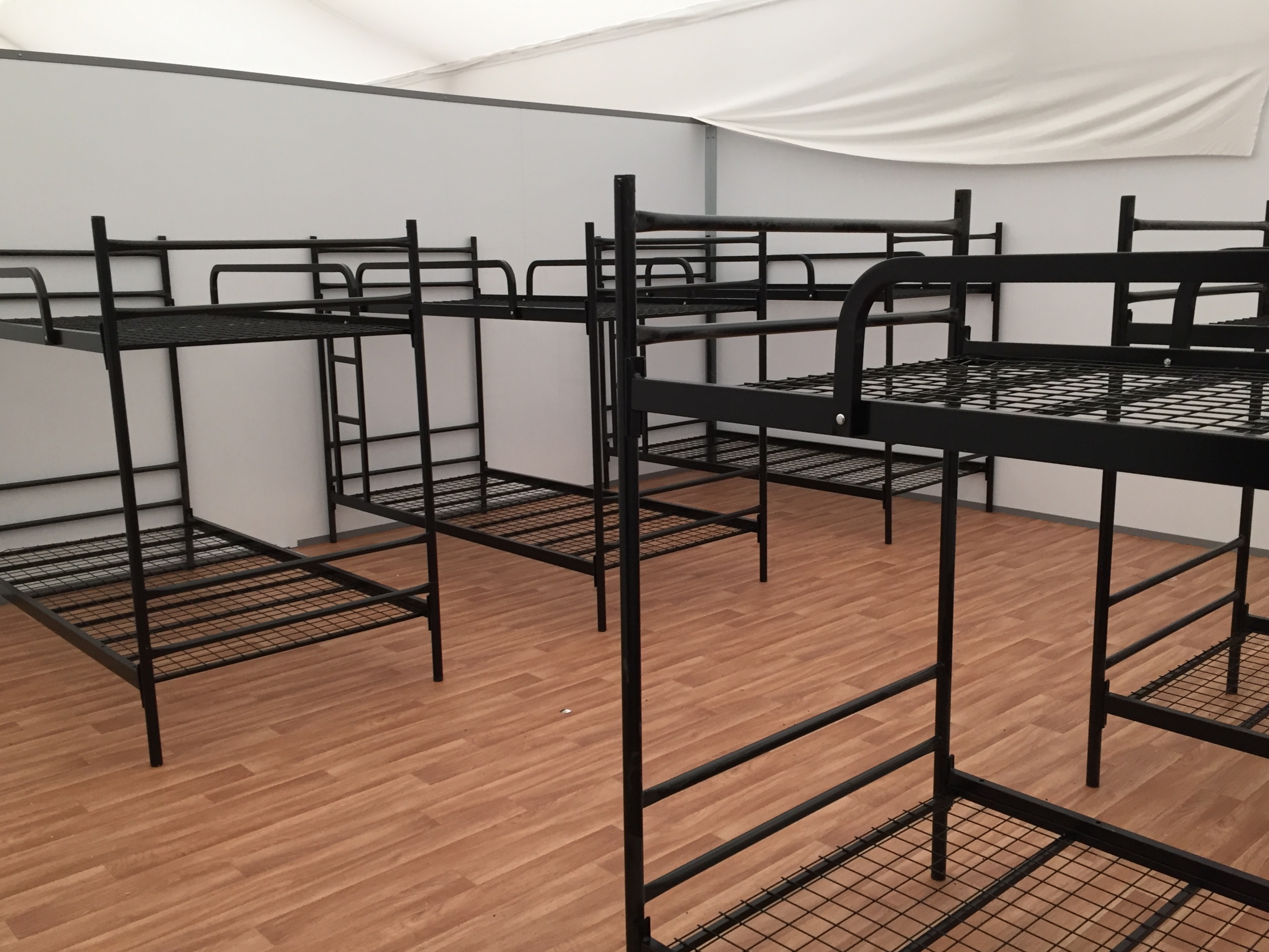 Hochbetten in den Schlafräumen. Viel Platz ist da nicht für die einzelnen Menschen. Es ist geplant, dass jede*r am Aachener Westbahnhof nur sechs bis Aachen Wochen bleibt.