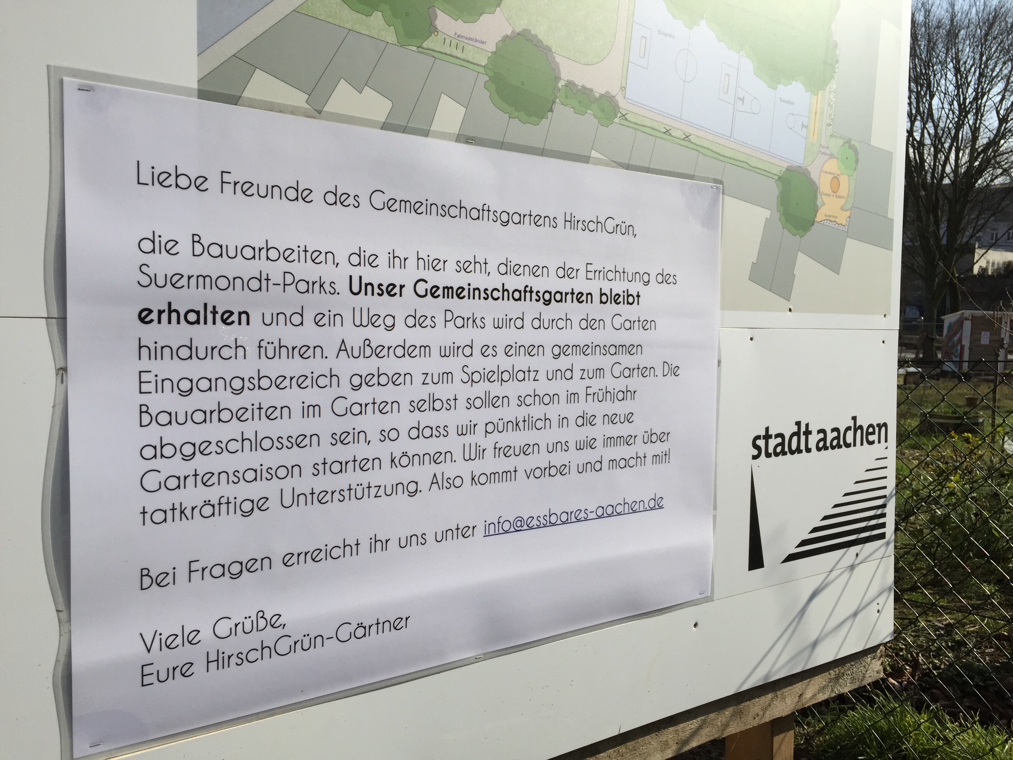 Blick auf das Gelände von der Straße aus. Die Stadtverwaltung informiert über das Projekt: den Suermondt-Park, der dort gerade angelegt wird.