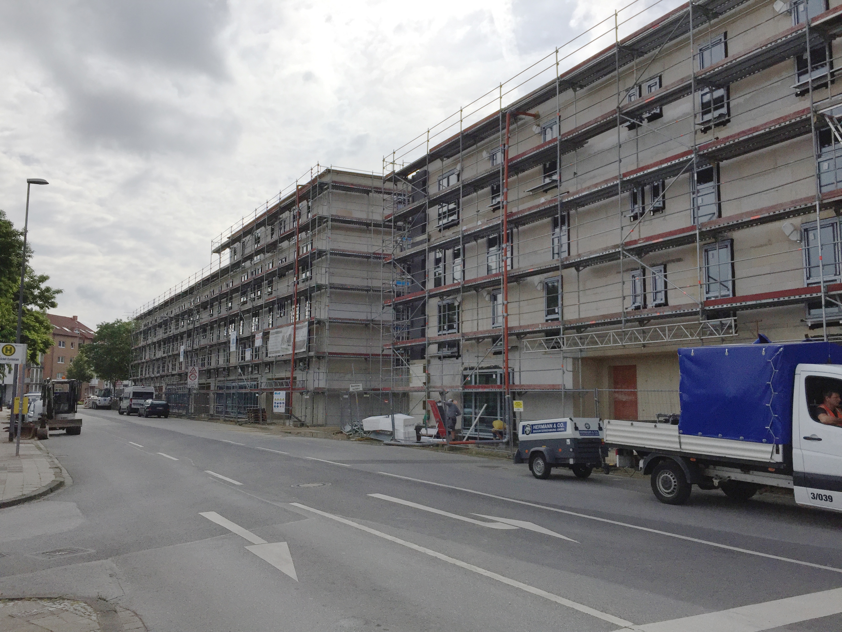 Das Neubau-Projekt befindet sich zwischen einem Kindergarten und dem Geschwister-Scholl-Gymnasium, direkt gegenüber von der neuen DITIB-Moschee. Diese Moschee wird seit vier Jahren gebaut, ein Ende ist nicht abzusehen. Schneller fertig werden wohl die 77 Wohnungen der GeWoGe. Noch 2016 im Herbst sollen die ersten Mieter einziehen. Die Planung liegt in den Händen der „pcb Architekten“.