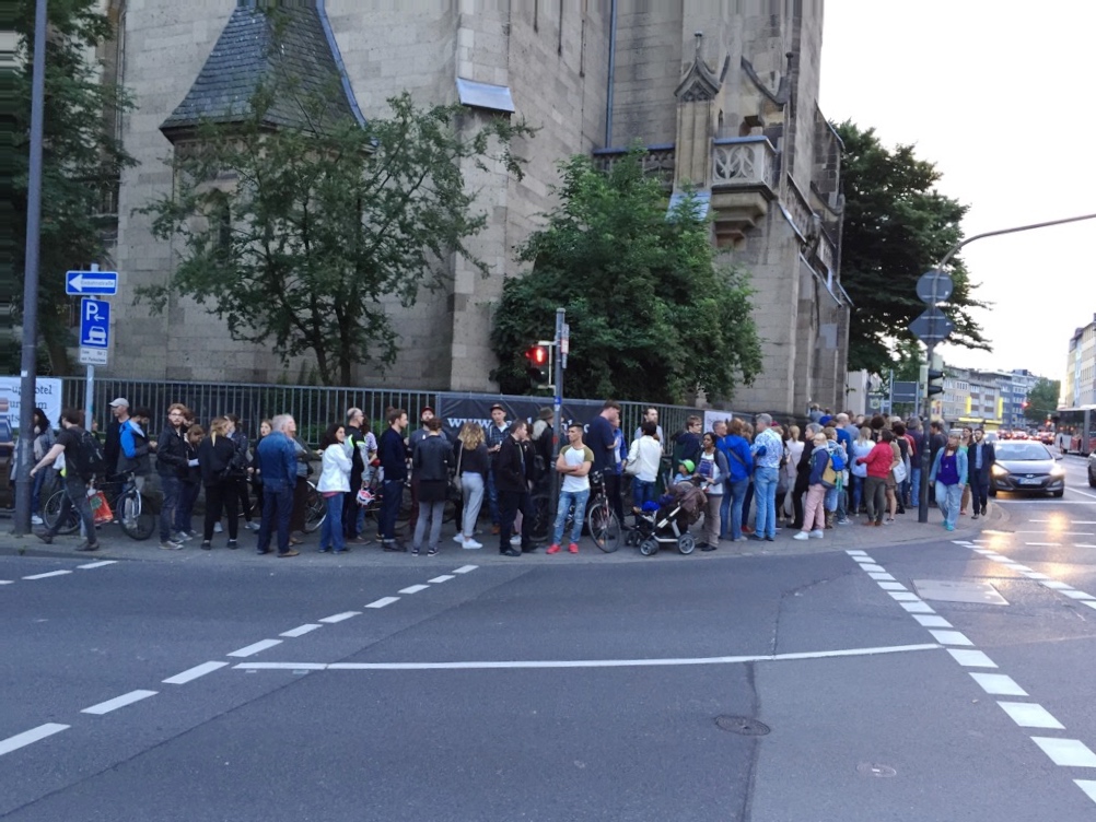„Hotel total“. Während drinnen schon viel Volk versammelt war, warteten draußen die Menschen darauf, eingelassen zu werden.