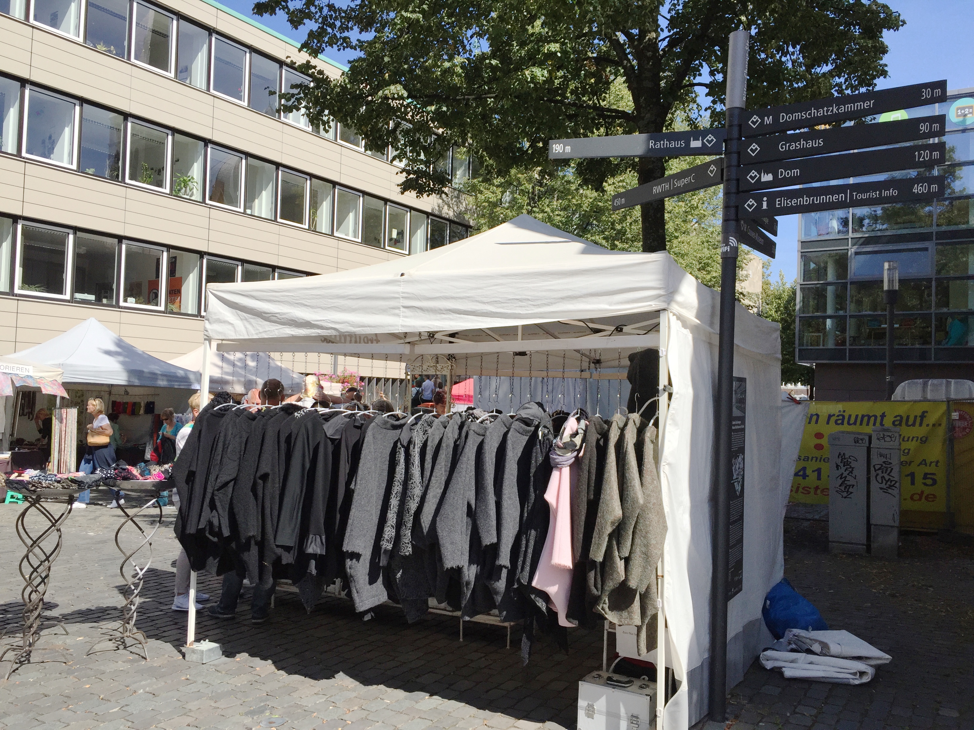 Es ist wieder so weit, und es ist schönstes Sommerwetter. In Aachens Innenstadt ist Handwerkermarkt, zum 40. Mal. Gefühlt eine Million Menschen sind in die Stadt gekommen und quetschen sich auf sieben Plätzen an den Ständen der Bastelkünstler vorbei. Von denen sieht man kaum was, (Ausstellerverzeichnis hier) wenn man wie ich 163 cm groß ist.
