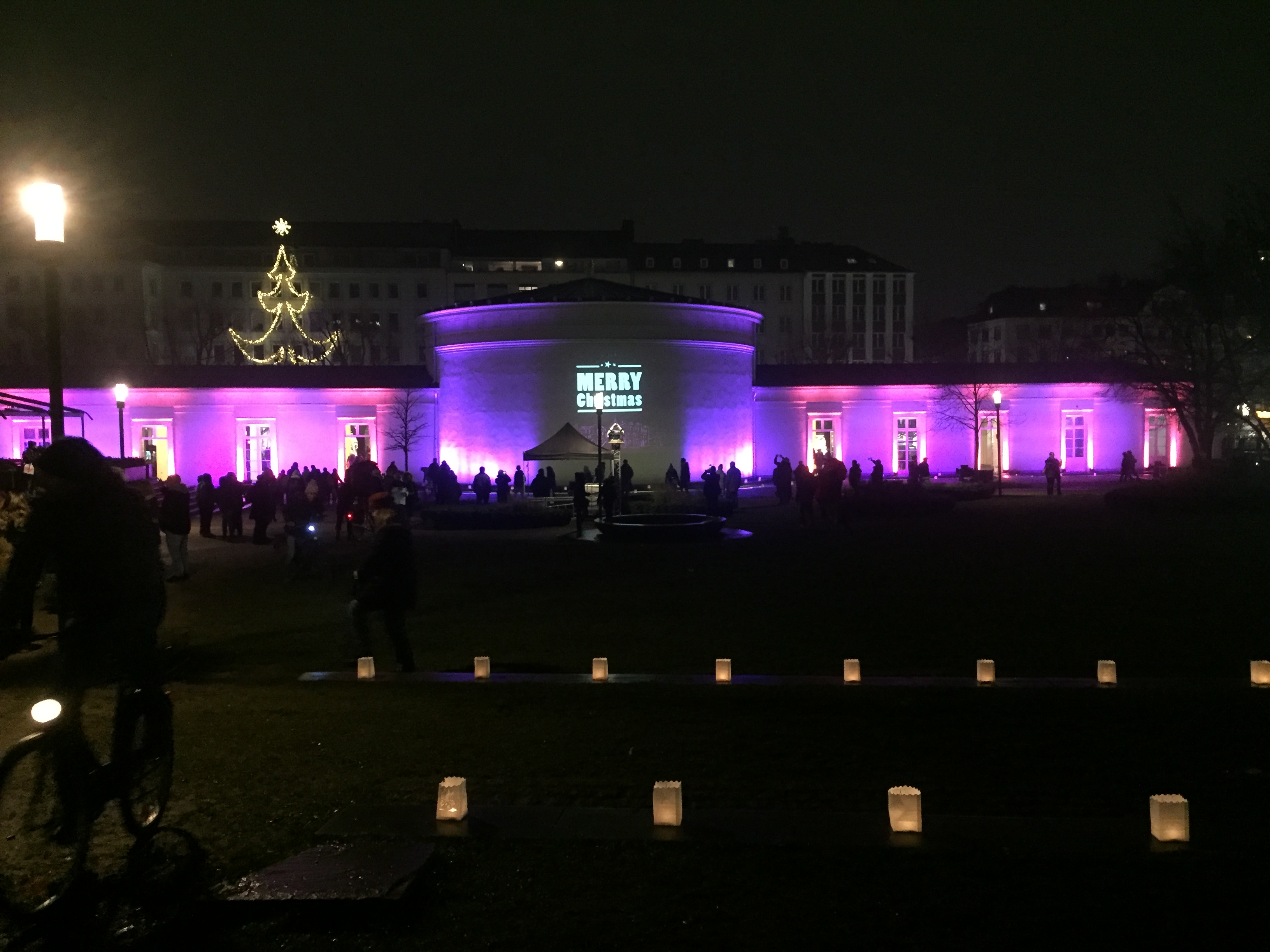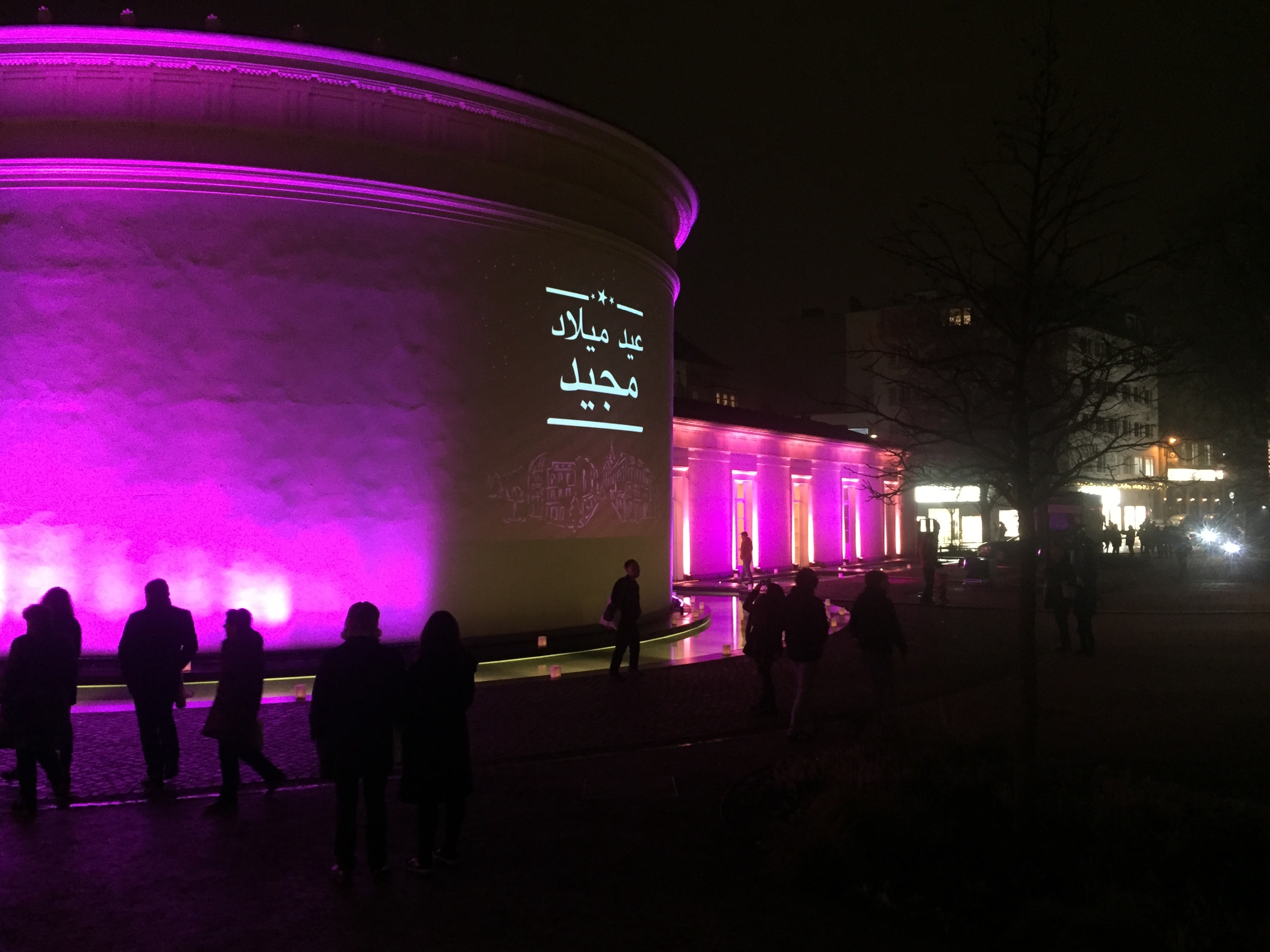 Licht in vielen unterschiedlichen Farben, dazu Weihnachtswünsche in verschiedenen Sprachen und Schriften gab es dieser Tage im Elisengarten zu sehen. Projektionsfläche war der Elisenbrunnen, und zwar die Rückseite, zum Garten hin. Einheimische und Touristen schauten erstaunt und freuten sich über die Aktion der Aachener Geschäftswelt.
