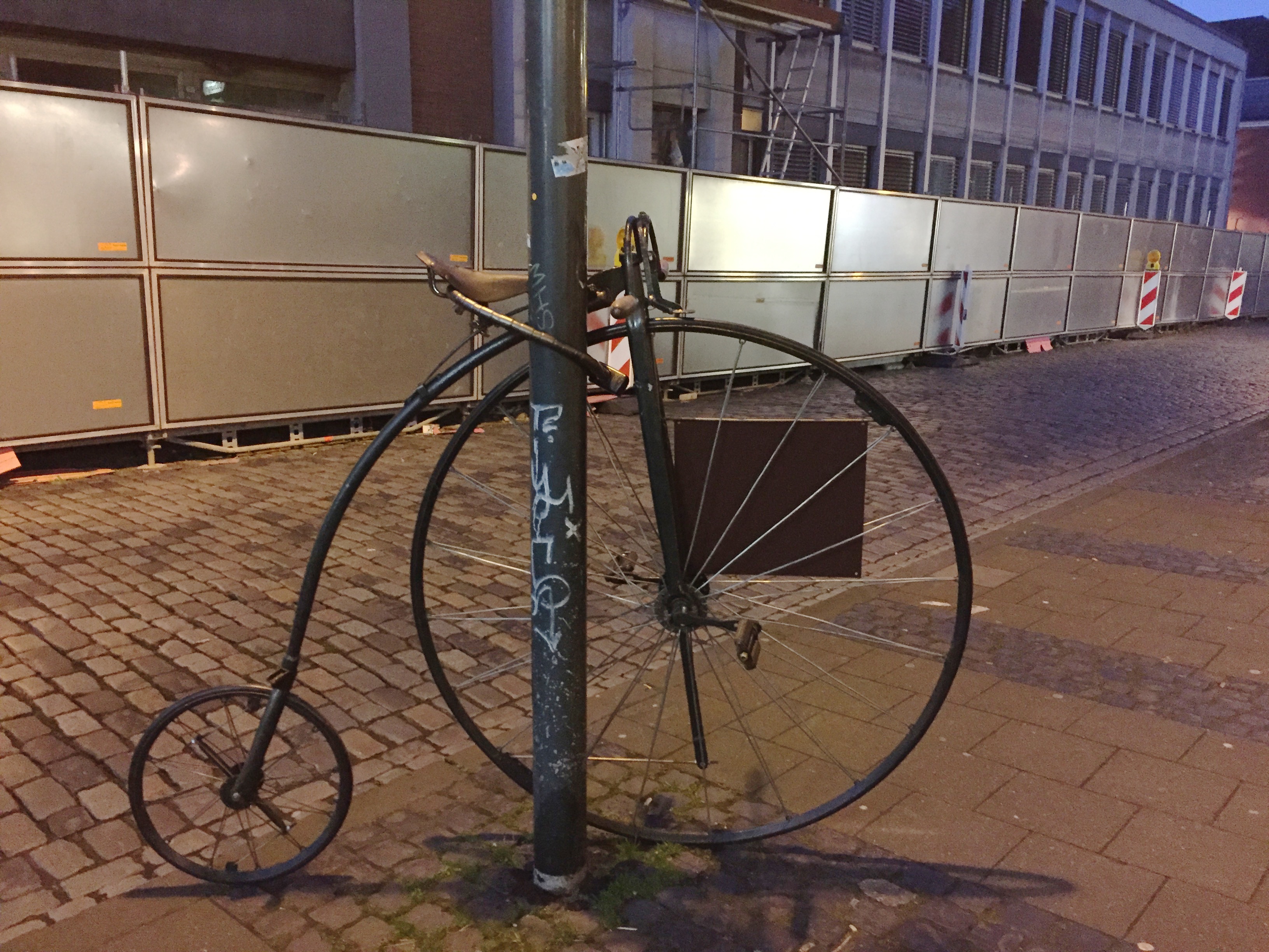 Tja, wer mit diesem Fahrzeug unterwegs ist, kommt nur langsam voran. Und unbequem ist es auch noch, man betrachte die Pflastersteine, über die das Hochrad durch Aachens Innenstadt rollt.