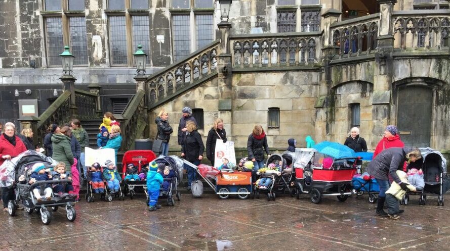 Es war kalt, es regnete, Sturmböen fegten über den Markt und es war Aschermittwoch: Eine Handvoll Tagesmütter, Mütter und Kleinkinder hatte sich gestern vor dem Rathaus zu einer Mahnwache eingefunden.