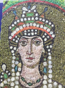Das ist die oströmische Kaiserin Theodora wie sie in einem Gebäude in Ravenna abgebildet ist. Die Dame muss sehr wohlhabend gewesen sein, sie trägt viel Schmuck. Sie war zunächst Schauspielerin, setzte sich gegen Mädchenhandel ein und soll hier nur den Text auflockern.