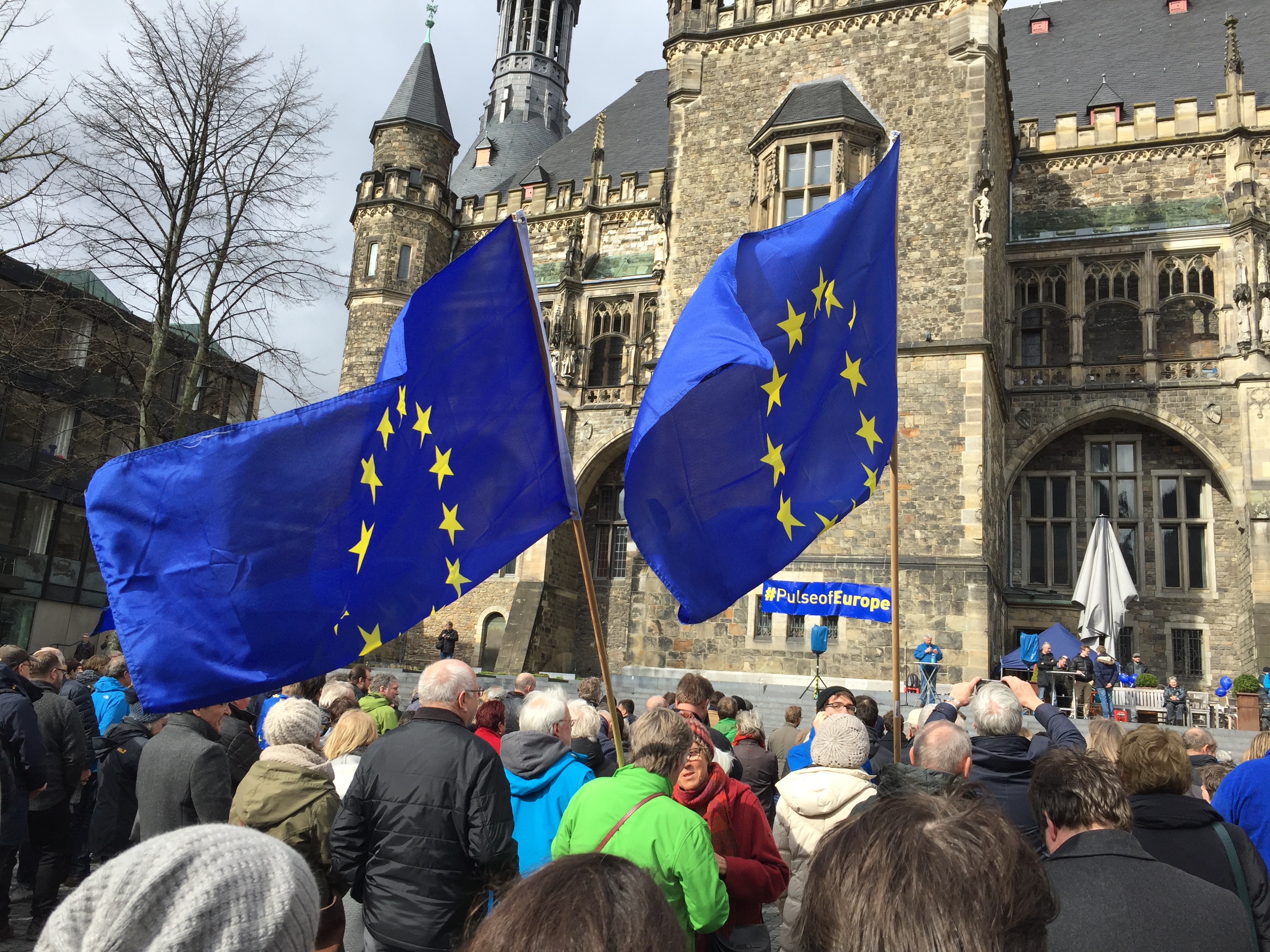 Ab 17 Uhr (Do., 23. März) tagt in der Volkshochschule (VHS) in der Peterstraße der Betriebsausschuss Theater und VHS. Er bespricht unter anderem die bisherigen Entwicklungen aus den Projekten der VHS zur Stärkung der Demokratie. Es gibt nichts Schriftliches, nur einen mündlichen Bericht. Mal hören, ob der Ausschuss schon von „Pulse of Europe“ (Foto) gehört hat und eventuell daran denkt, diese Bewegung in Aachen zu unterstützen.