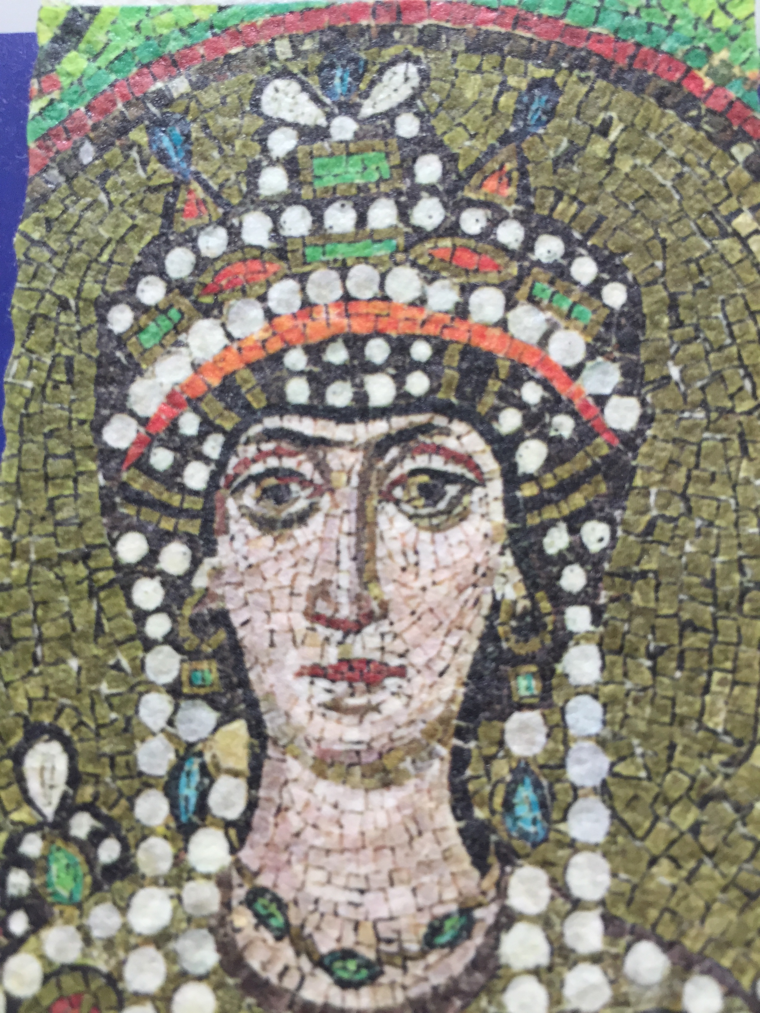 Das ist die oströmische Kaiserin Theodora wie sie in einem Gebäude in Ravenna abgebildet ist. Die Dame muss sehr wohlhabend gewesen sein, sie trägt viel Schmuck. Sie war zunächst Schauspielerin, setzte sich gegen Mädchenhandel ein und soll hier nur den Text auflockern.