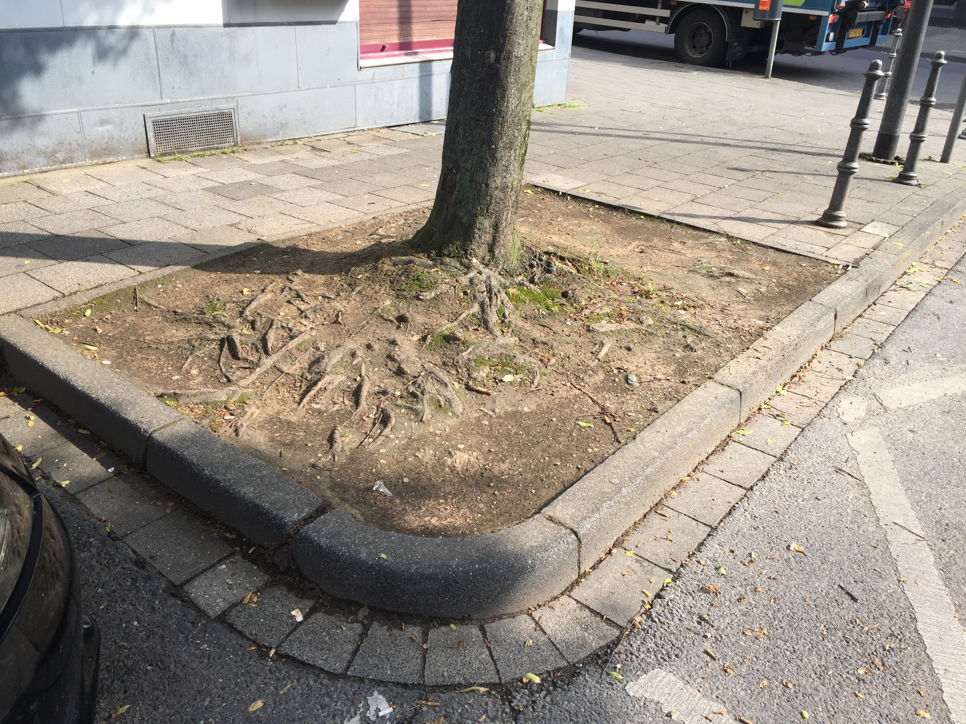 Oben: Eine Baumscheibe in einer Seitenstraße der Pontstraße, in der Nähe vom Ponttor – für die sich niemand von den Anwohnern zuständig fühlt oder keiner Zeit und Lust hat, hier etwas zu verschönern. Ganz anders auf der gegenüberliegenden Straßenseite (unten):