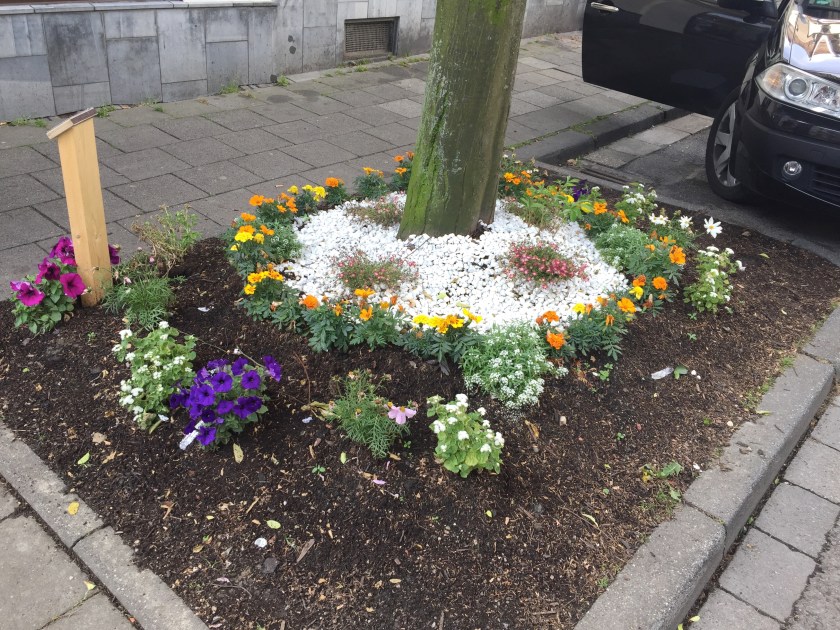 Normalerweise pflegen und bearbeiten hierzulande Menschen nur dann ein Stück Land, wenn es ihnen gehört oder sie es gemietet/gepachtet haben. Insofern ist diese bepflanzte Baumscheibe ein Hinweis auf außergewöhnliches Verhalten.