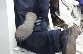 Frau: „Hier aus dem Kleidercontainer ragen zwei Füße!“