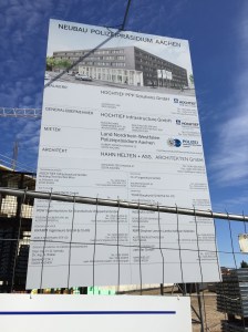 Hinweisschild vor dem neuen Polizeipräsidium. Auf den ersten Blick scheint das neue Präsidium doppelt so groß zu werden, wie das alte.
