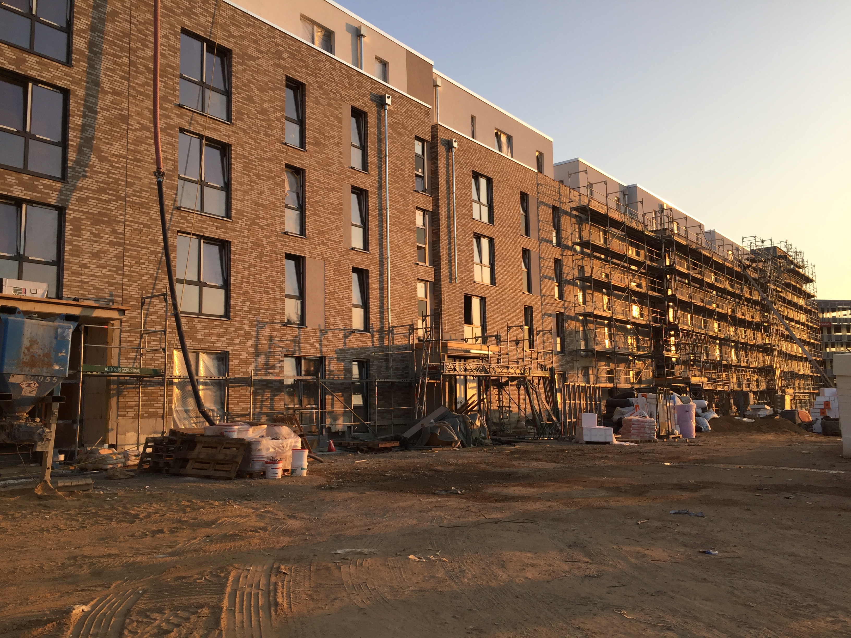 Und eine Ecke weiter wächst diese Anlage in die Luft: vier, teilweise fünf Etagen hoch und noch Penthäuser oben drauf. Das ist ein riesiger Klotz, dessen Außenfassade aber nicht so dunkel wird, wie die Gebäude An den Frauenbrüdern und an der Jülicher Straße. Am Freunder Weg werden 2018 etwa 700 Menschen einziehen. . .