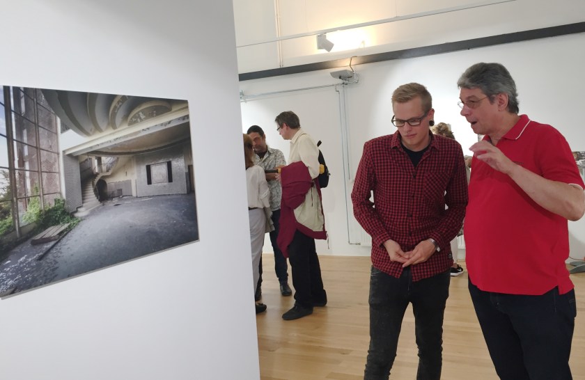 Sebastian Schwarz (Mitte) in seiner Ausstellung im Gespräch mit einem Besucher. „Lost Places“ ist noch bis zum 13. August zu sehen.