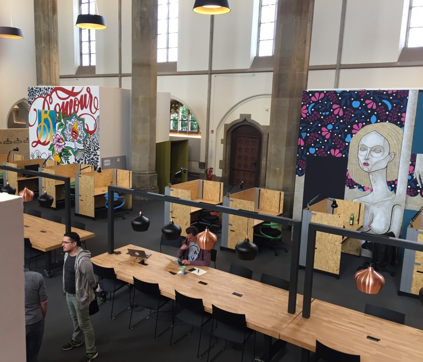 Die Kirche St. Elisabeth in Aachen, Jülicher Straße, ist jetzt ein „digital hub“. Es gibt dort jede Menge Arbeitsplätze für Menschen, die in der digitalen Welt ein Unternehmen hochziehen möchten. Eigentümer der Kirche am Blücherplatz ist Immobilienunternehmer Norbert Hermanns, der auch Vorsitzender der Landmarken AG ist.