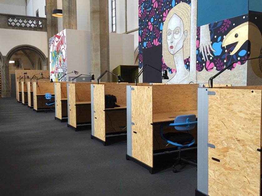 Die Arbeitsplätze sind an Kargheit nicht zu überbieten. Aber sie sind zugleich darauf angelegt, dass die Nutzer – falls erwünscht – ins Gespräch über ihre Projekte kommen und sich gegenseitig unterstützen. Gleichzeitig gibt es, wenn man einmal mit seinem Rechner in einer Koje Platz genommen hat, kaum Ablenkung. Es gibt übrigens auch quasi schalldichte Ecken zum Telefonieren. Die Möglichkeit, ungestört eine Arbeitskonferenz zu veranstalten ist ebenfalls gegeben.