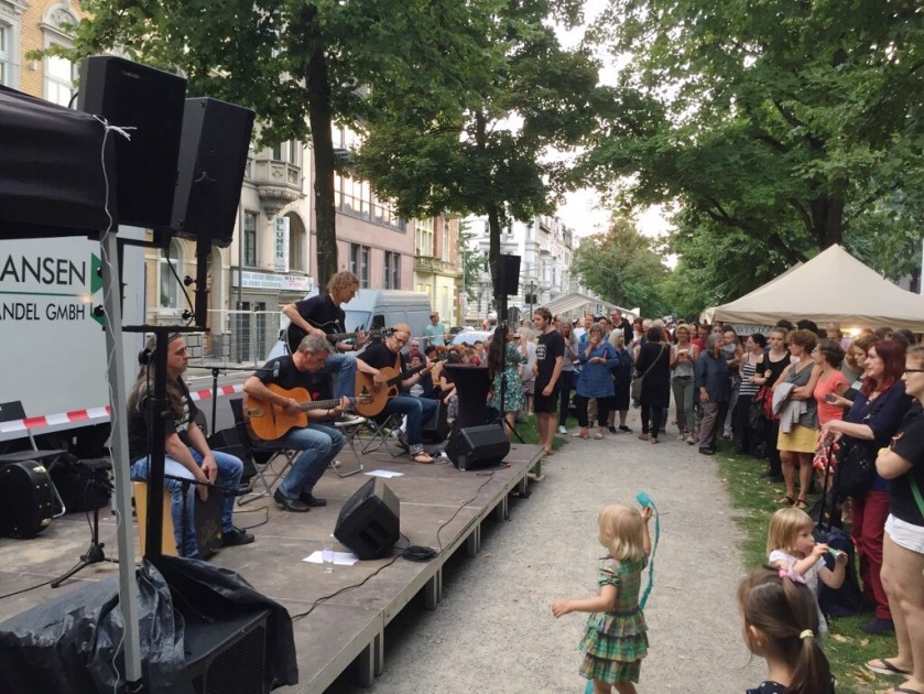 Ansonsten sieht man sich vielleicht heute beim Fest im Frankenberger Viertel. Schon gestern war es dort auf dem Mittelstreifen der Oppenhoffallee sehr gemütlich (s. unten). Es gab prima Musik (Name der Band leider entfallen). Heute findet dort ein Flohmarkt statt. (Foto: Henning Brinkmann)