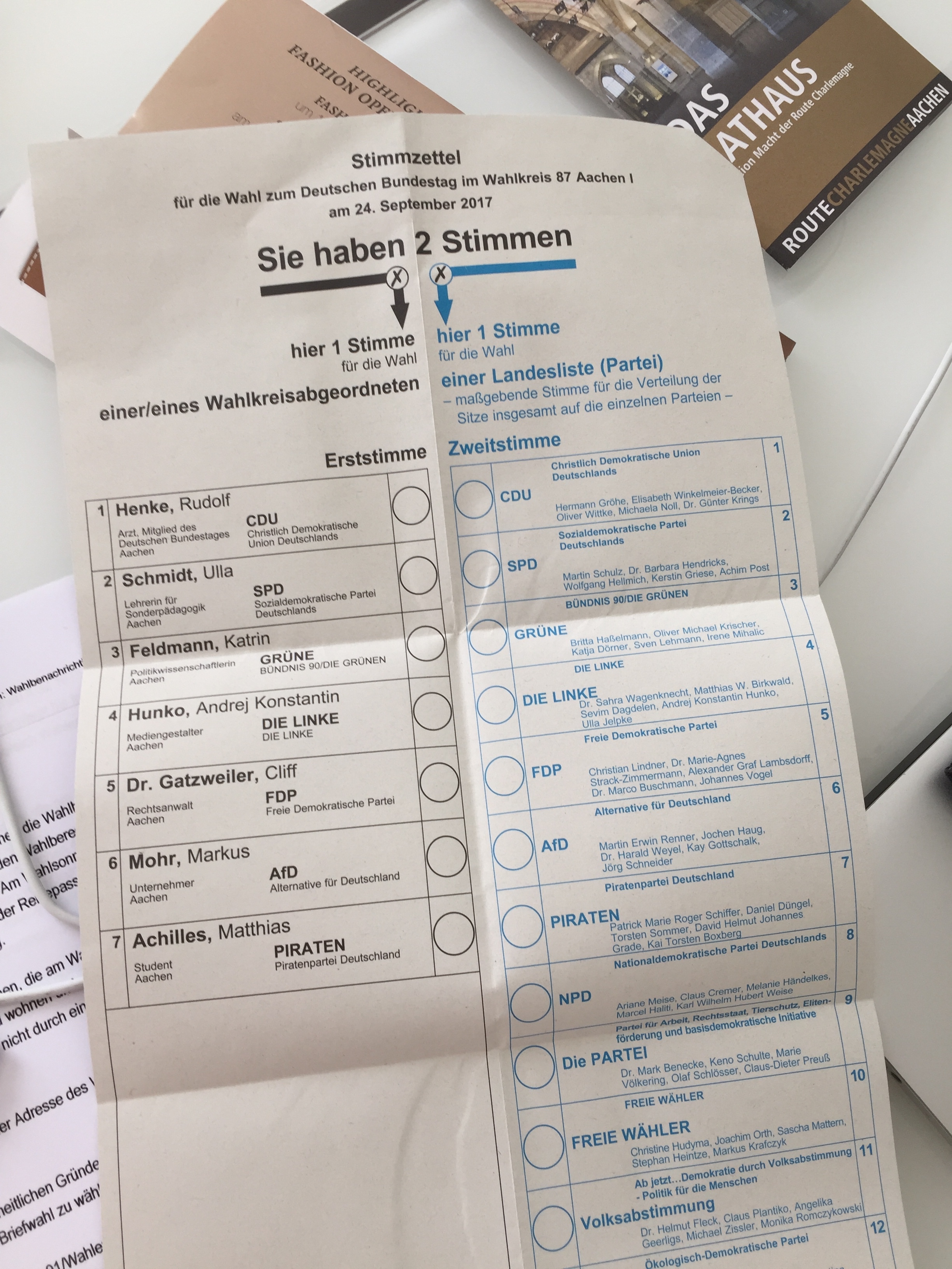 Zum Sonntag ein paar Infos an die geneigte Leserschaft: Ihr müsstet mittlerweile alle eure Wahlbenachrichtigung bekommen haben (außer diejenigen, die im Ausland wohnen). Die Wahlbenachrichtigung und den Personalausweis (oder den Reisepass) müsst ihr am 24. September mit ins Wahllokal bringen.