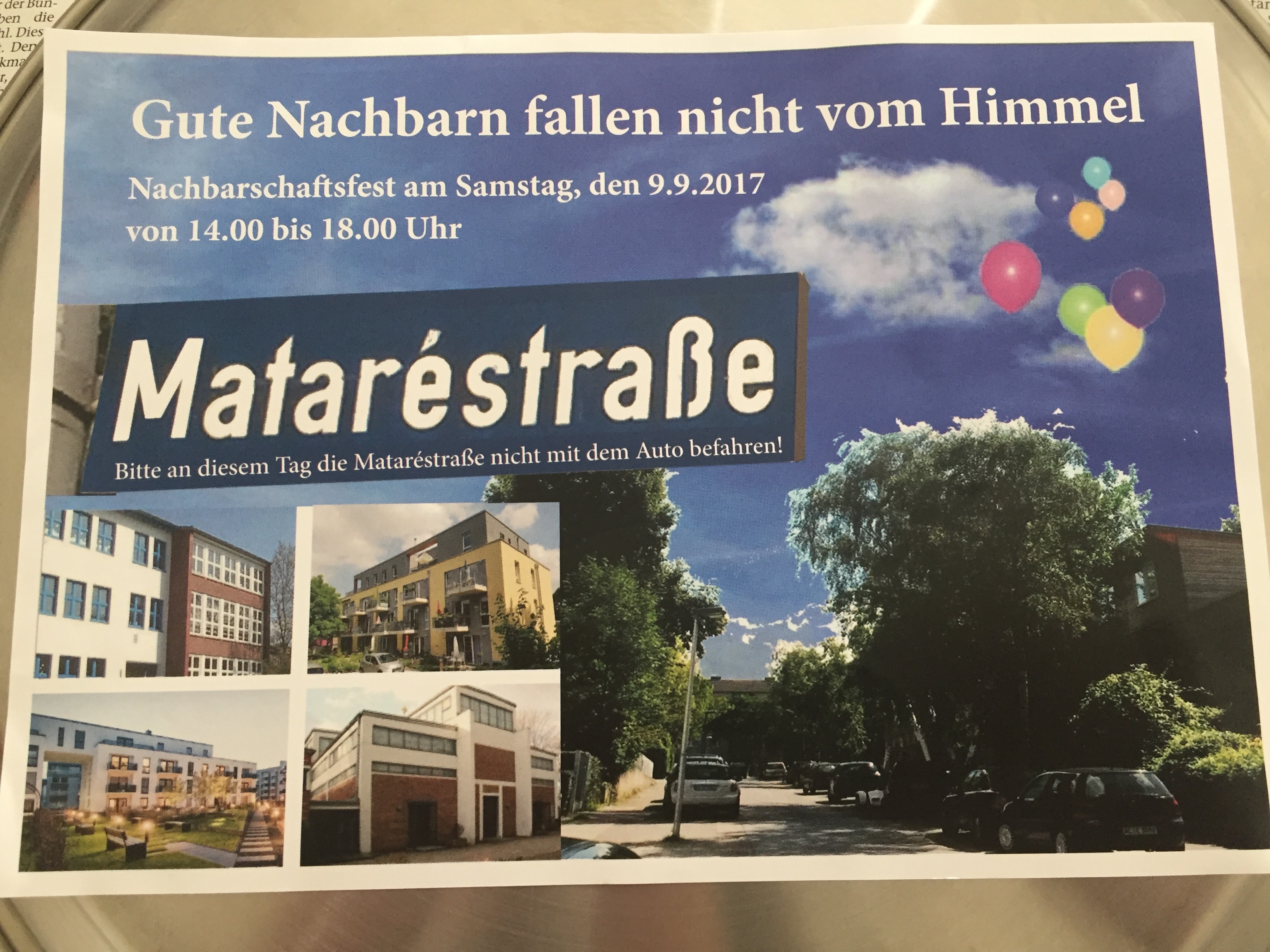 Die Mataréstraße feiert am kommenden Wochenende ein Nachbarschaftsfest. Vermutlich ist es das erste Nachbarschaftsfest überhaupt – in der Geschichte der Straße.