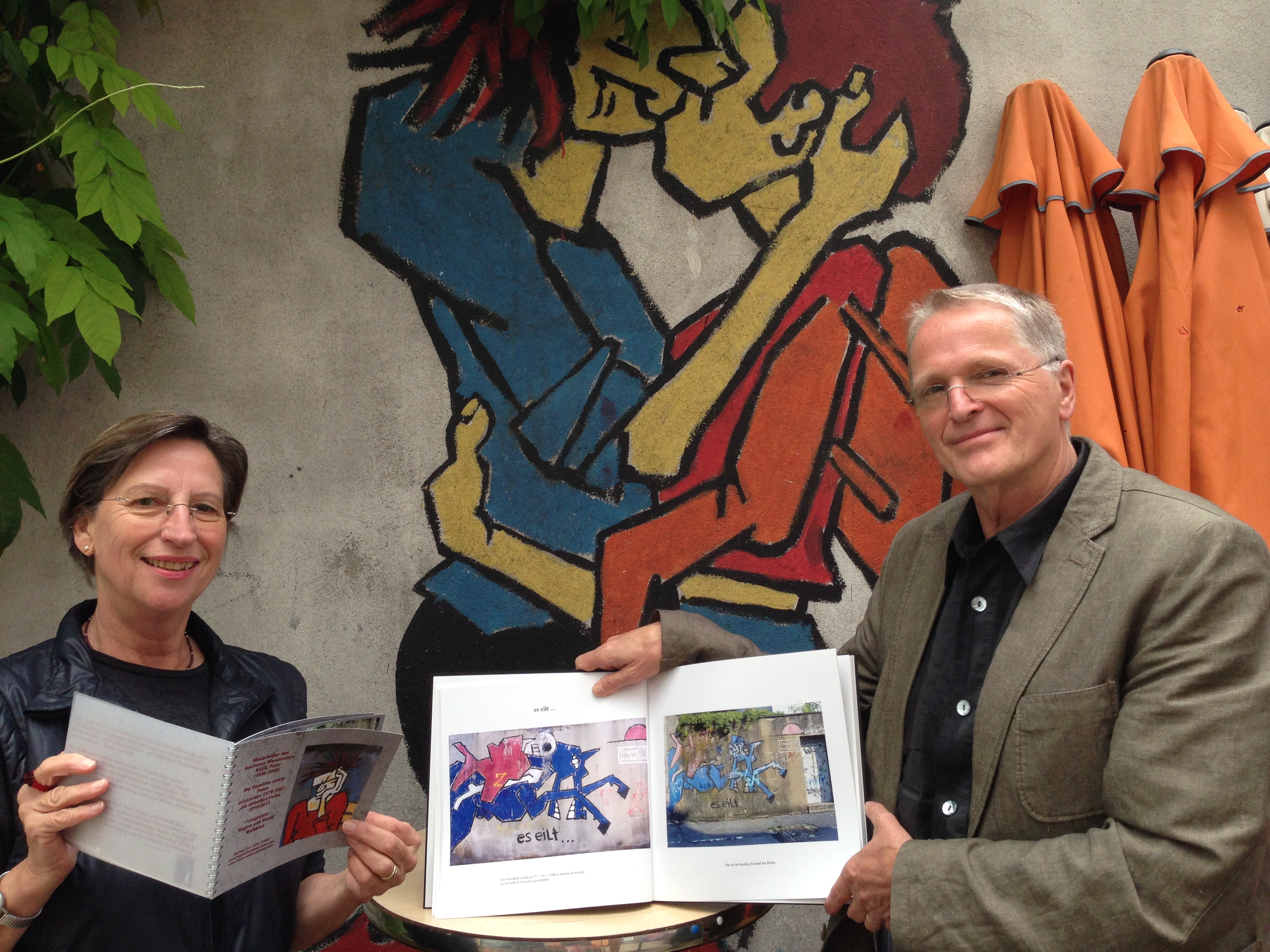Die Streetart-Experten Regina und Dieter Weinkauf vor einem der wenigen erhaltenen Werke des Aachener Wandmalers in der Aachener Innenstadt. Den beiden verdankt die Nachwelt eine umfangreiche Dokumentation der oft von Behörden-Mitarbeitern mutwillig zerstörten Werke.
