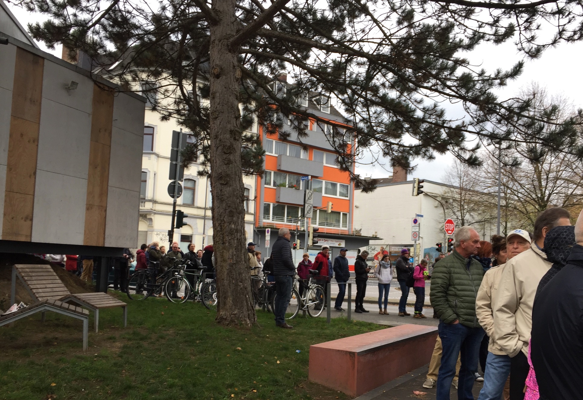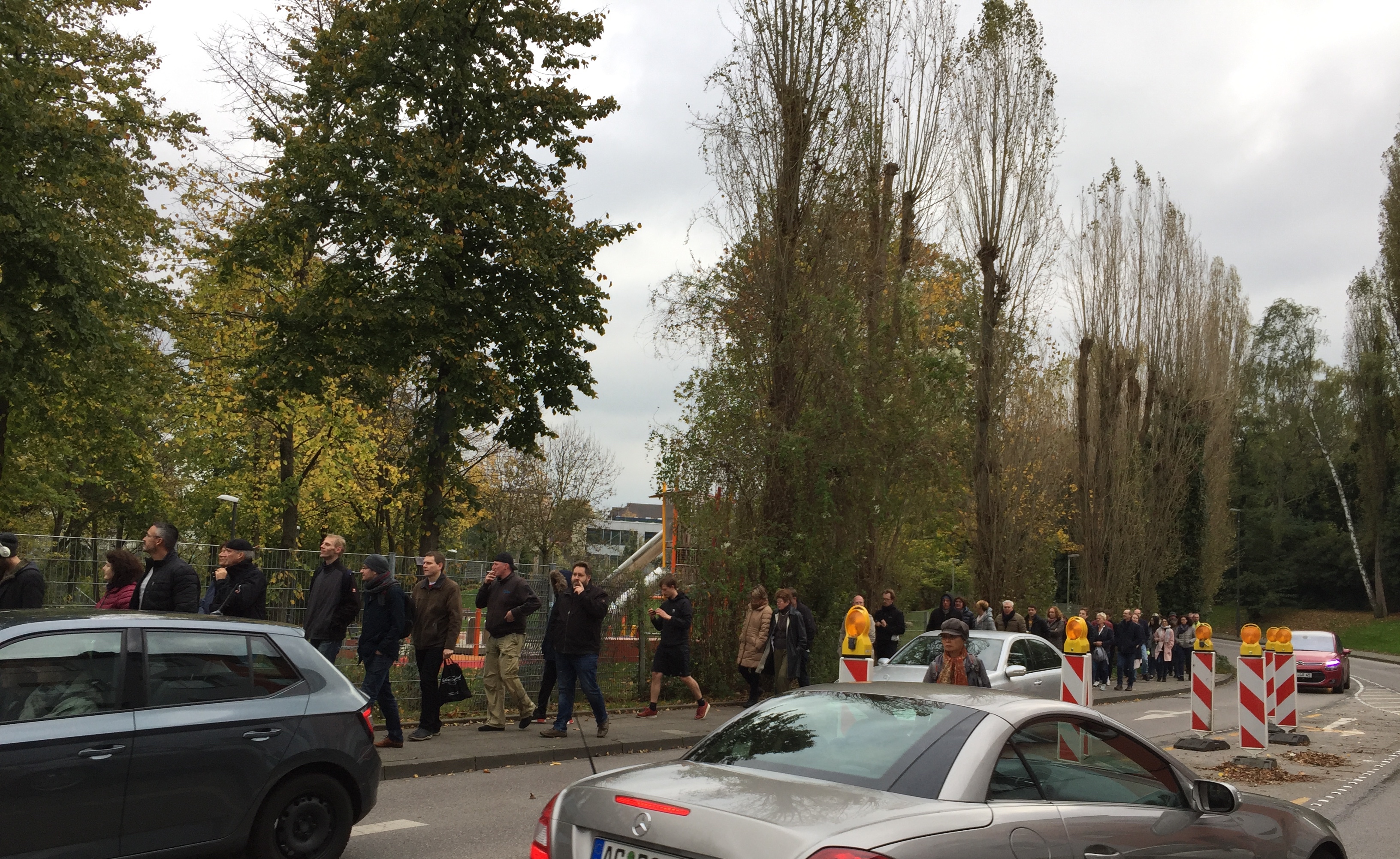 Anstehen für ein Bändchen, das am kommenden Freitag den Zutritt zum Katschhof erlaubt: Menschen in der Aretzstraße vor dem Depot.
