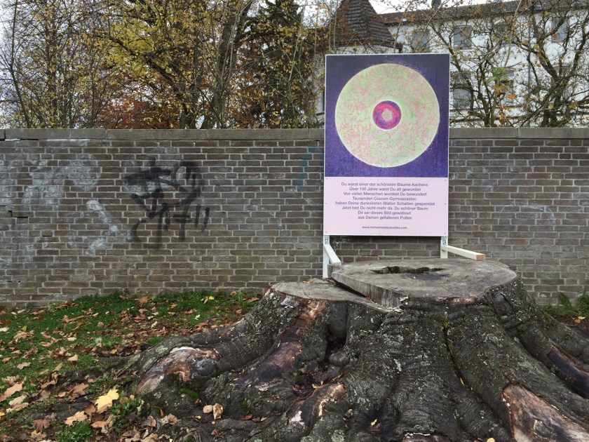 Anwohner der Lütticher Straße haben einem Baum (vorne) ein Denkmal gesetzt. Dort steht: „Du warst einer der schönsten Bäume Aachens. Über 100 Jahre warst du alt geworden. Von vielen Menschen wurdest du bewundert . . .“ usw. usw. Mehr unter mohammedsparadies.com