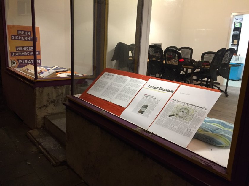 Falls ihr an der Ecke Lothringerstraße/Wilhelmstraße vorbeikommt, dann werft einen Blick in das neue Büro der Aachener Piratenpartei. Dort gibt es ab sofort wieder – wie im alten Büro, das leider gekündigt wurde – im Schaufenster Berichte über die aktuellen Themen und die nervenzerfetzende Arbeit der Piratenfraktion im Rat der Stadt.
