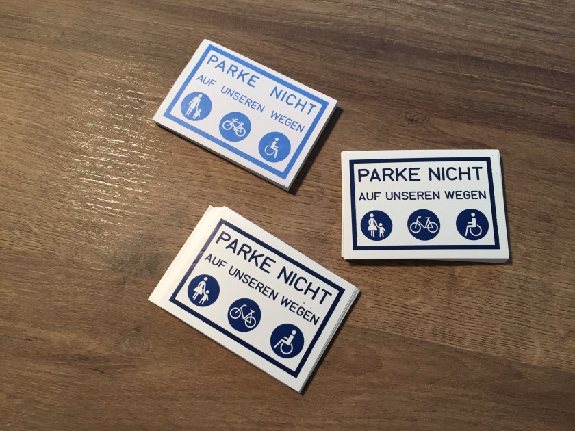 Falls ihr also Fragen und Anregungen habt, kommt ins Piratenbüro. Dort gibt es auch die unten abgebildeten Aufkleber für Menschen, die sich über Pkw-Fahrer ärgern, die auf Fahrradwegen und Fußgängerwegen parken. (So lange der Vorrat reicht.)