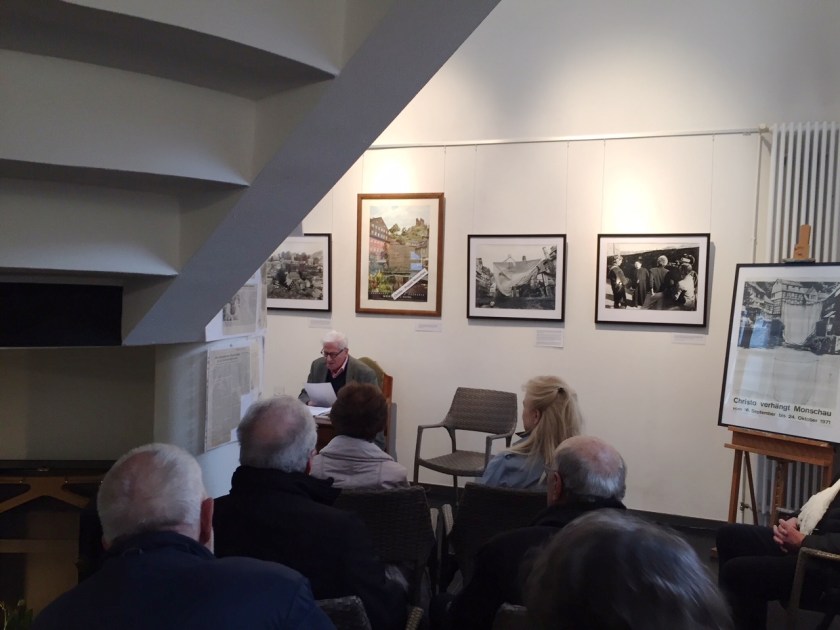 Schöne Ausstellung in der verwinkelten Galerie Beumers in Monschau. Es wird an die Zeit erinnert, als Christo in Monschau aktiv war. Am Tisch: Kaspar Vallot, 92 Jahre alt.