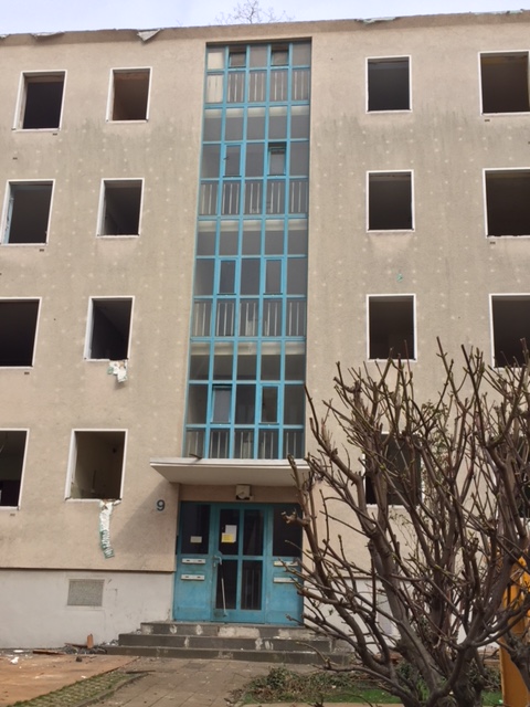 „Hier wird bezahlbarer Wohnraum vernichtet“ seht in großen Buchstaben an der Wand. Nun ja, die neuen Bewohner können sich freuen. Sie bekommen schöne, helle Wohnungen. Die alte Substanz war schon sehr heruntergekommen. Zuletzt haben Flüchtlinge die Gebäude bewohnt.
