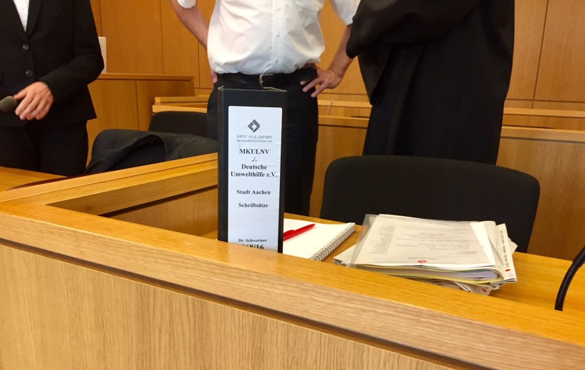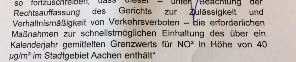 40 Mikrogramm sind laut EU gestattet, 50 Mikrogramm pro Kubikmeter Luft und mehr erreicht Aachen. Und zwar nicht nur an einzelnen Punkten – an der Wilhelmstraße oder am Adalbertsteinweg etwa, nein FLÄCHENDECKEND. Der Richter verlas alte und neue Werte von diversen Messpunkten. Es war erschütternd, das mal so konzentriert zu hören. Und dabei warten wir hier auf Radschnellwege, Bürgerticket, Tempo 30 in der gesamten Stadt, Lastentransport mit Pedelec usw und andere coole Maßnahmen schon so lange.
