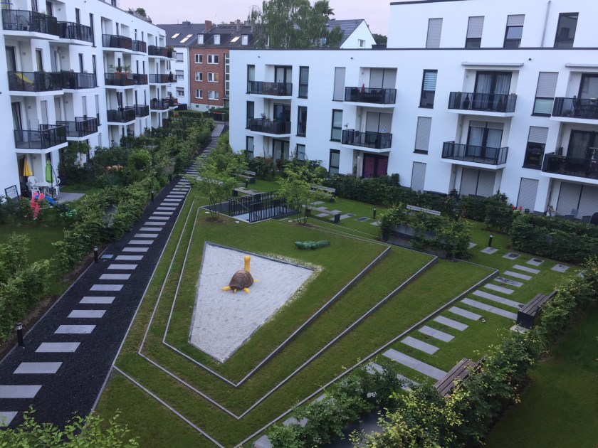 Das Erscheinungsbild wird sich stark verändern, und zwar nur indem man die Platten enger aneinander rückt. Jetzt ist es noch so: Die Platten in ihrem Abstand befinden sich in einem abgestimmten Verhältnis zu den Grünflächen, zu dem abgestuften und versetzten Dreieck in der Mitte, zu den Bänken und Lampen, zu den Balkonen, ja zur ganzen Innenanlage. Alles ist in seinen Proportionen und Dimensionen ideal aufeinander abgestimmt.