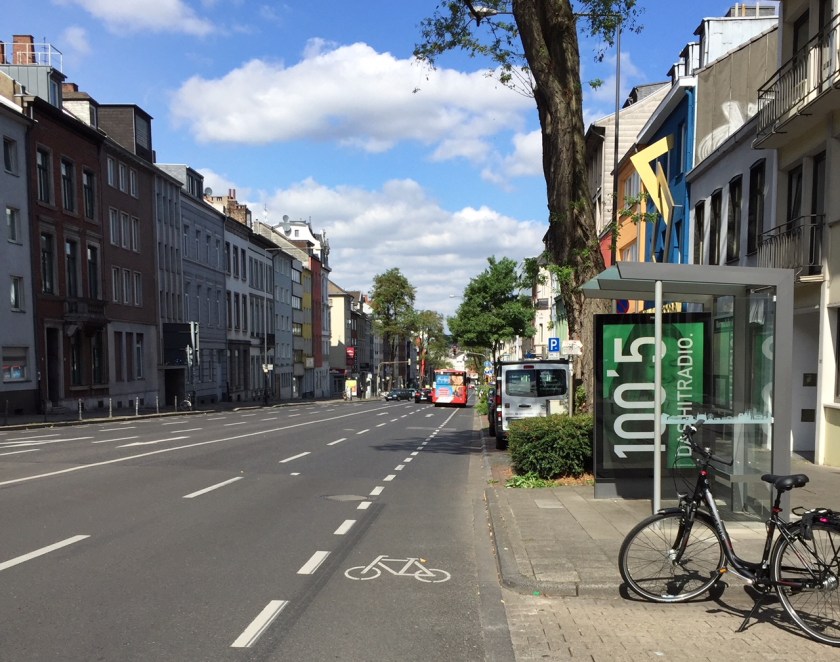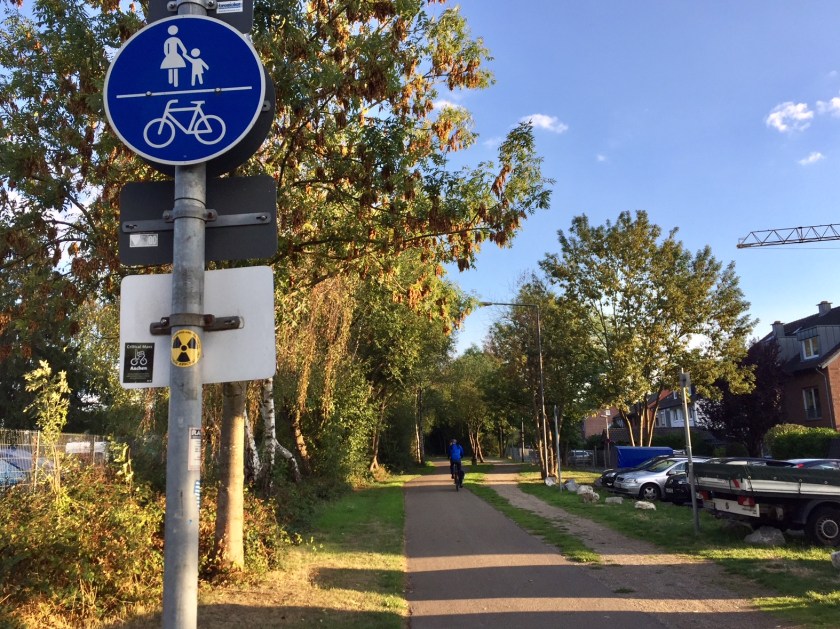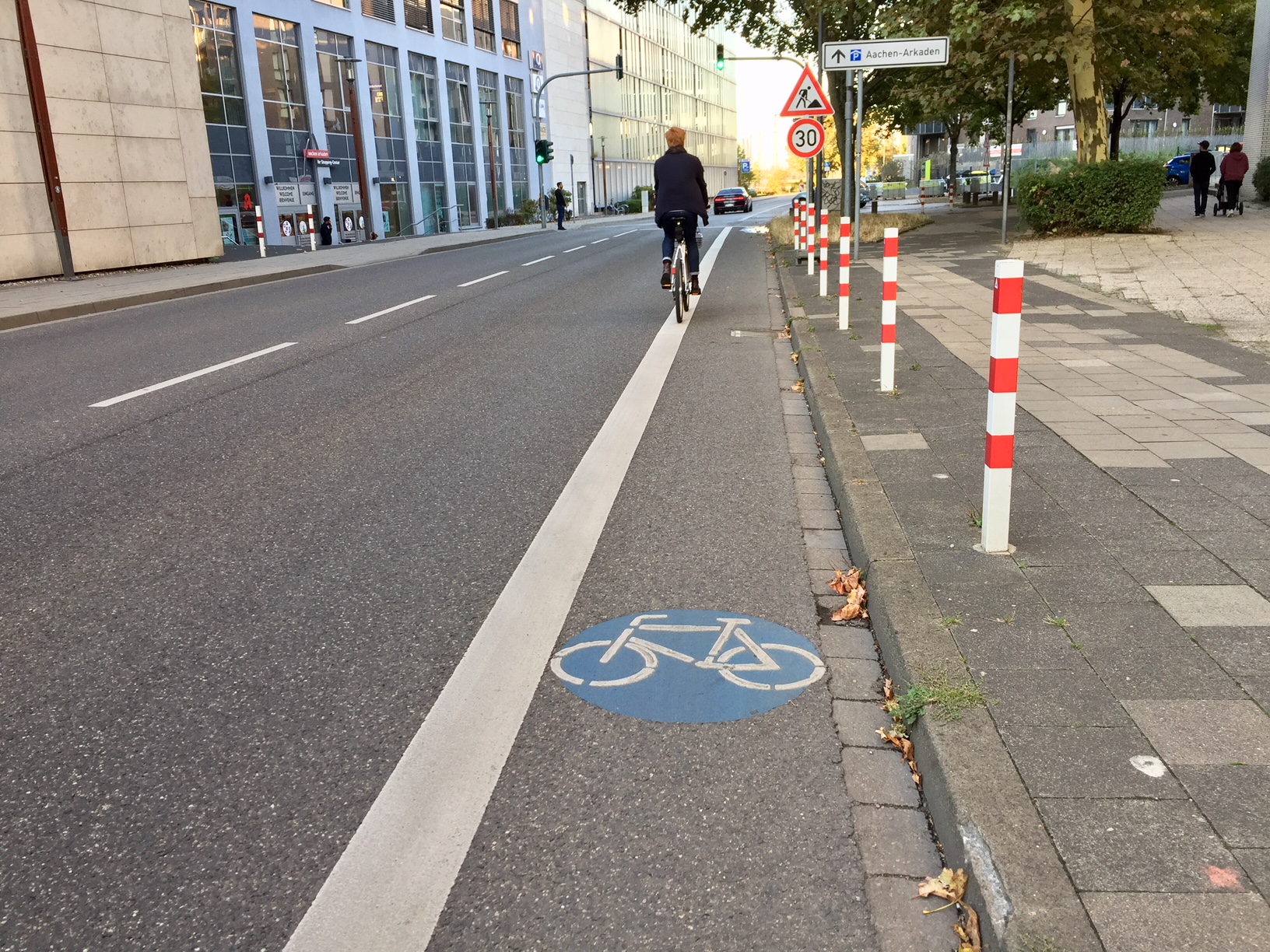 Es ist bestimmt verdammt schwer, in relativ enge Aachener Straßen die FahrradfahrerInnen zu integrieren. Aber nachdem jetzt bestimmt 20 Jahre lang das Rad immer beliebter wird (und zunehmend Leute mit dem Pedelec unterwegs sind), wäre es doch mal an der Zeit, zügig ein Radwegenetz aufzubauen – mit einheitlicher Darstellung auf der Straße. Unten ist ein weiterer Radweg abgebildet, einer von denen, die RadlerInnen sich mit FußgängerInnen teilen müssen. Das führt zu Reibereien. Wie die Fußgänger sich manchmal erschrecken, das ist der Wahnsinn . . .