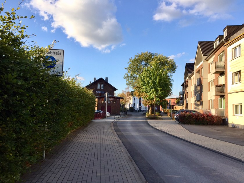 Es ist eine Fahrradstraße (hinten: der alte Bahnhof von Brand), die man als solche gar nicht erkennt. Ja, Aachen hat tatsächlich eine Fahrradstraße, es ist ein kurzes Stück, man beachte das Schild links. Es gibt in Aachen übrigens eine weitere Fahrradstraße, wo aber Autos nicht zugelassen sind.