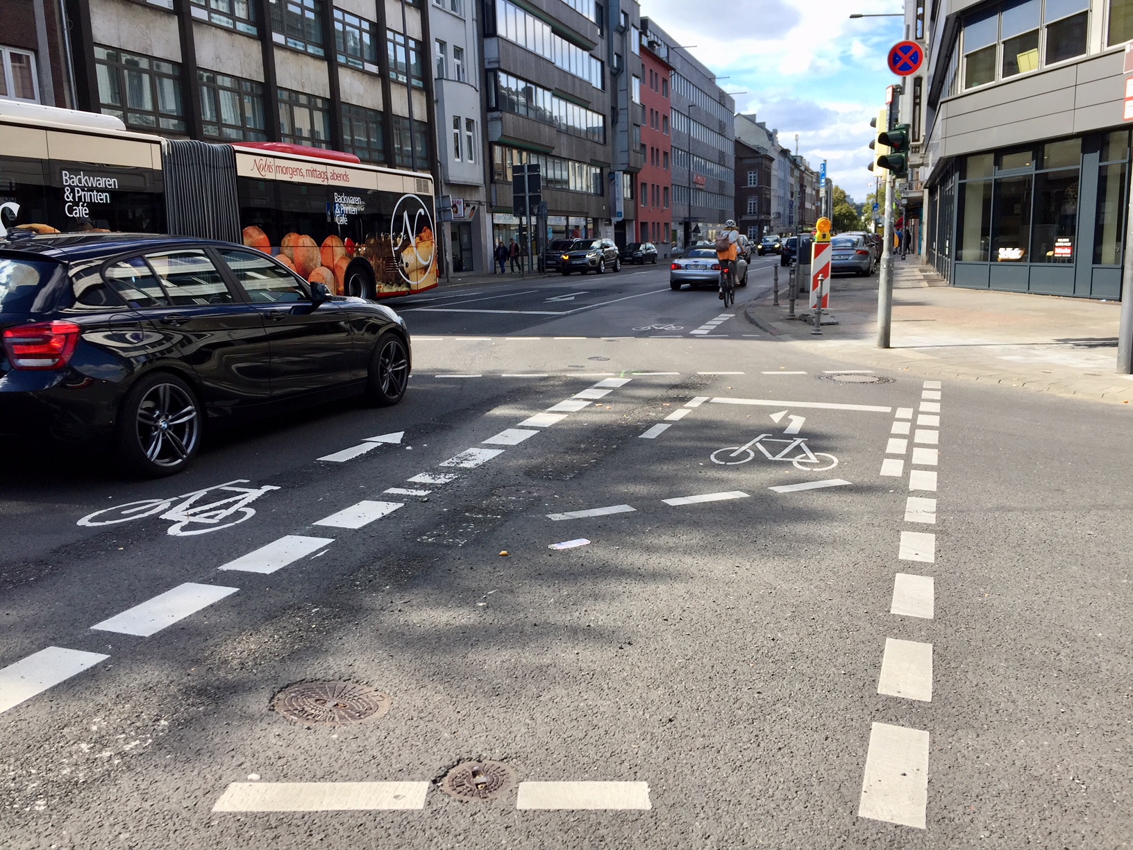 Beim Fahren über alle möglichen Aachener Fahrradwege kommen mir Fragen. Warum macht sich die Stadtverwaltung die Mühe und lässt sich praktisch für jeden Fahrradweg eine neue Gestaltung einfallen? Hier zum Beispiel (Theaterstraße) ist ein Fahrrad auf blauem Grund abgebildet . . .
