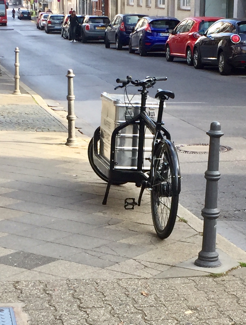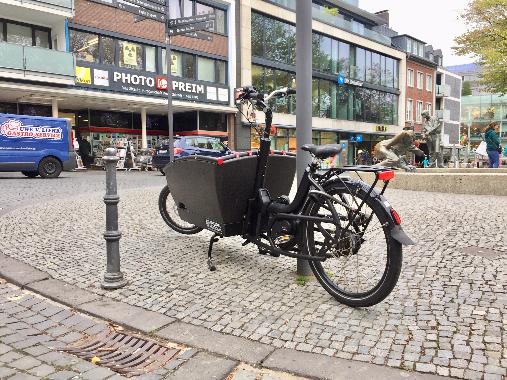 Ein Lastenfahrrad ist eine praktische Sache. In Aachen sieht man dergleichen immer öfter. Wie hier am Geldbrunnen.