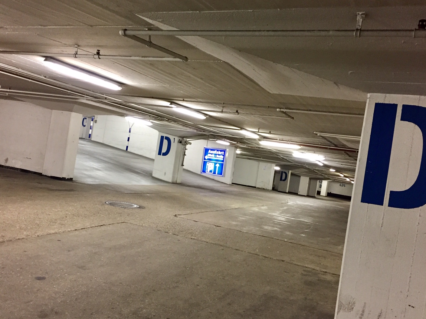 Die untere von vier Ebenen (D) ist nur in der Weihnachtszeit voll: „Parkhaus Rathaus“ in der Innenstadt von Aachen (Foto: 19. November 2018).