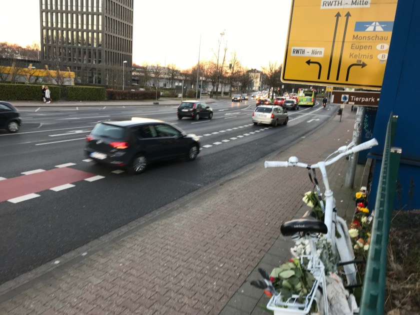 Vor der Sitzung im Verwaltungsgebäude, Lagerhausstraße, gab es dort übrigens eine imposante Mahnwache mit über 100 (Anruf einer Teilnehmerin: Es seien über 300 gewesen) Aachener Radlern. Es wurden keine Sprüche gebrüllt, nur relativ still der Verunglückten gedacht und die Politik an ihre Pflicht erinnert, auch für Menschen auf Fahrrädern unfallfreies Fortkommen auf Aachens Straßen zu ermöglichen.