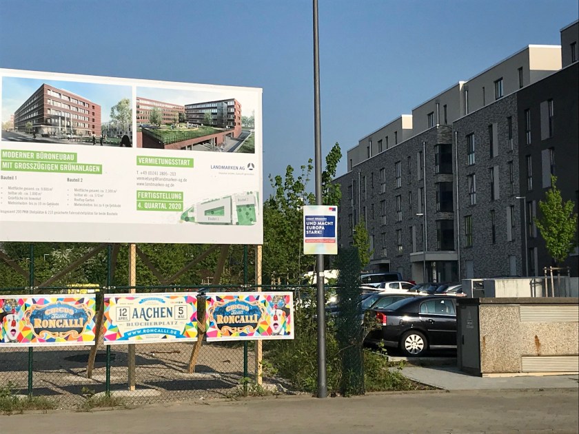 Schade. Ich hatte gedacht, es würden da weitere Wohnungen hochgezogen. Dass es in Aachen einen Mangel an Büros gibt, war mir – ganz ehrlich – nicht bekannt. „Moderner Büroneubau mit großzügigen Grünanlagen“ steht auf dem Bauschild. 200-Pkw-Stellplätze werden errichtet, dabei ist direkt 50 Meter weiter das große Parkhaus der Aachen Arkaden ständig leer.